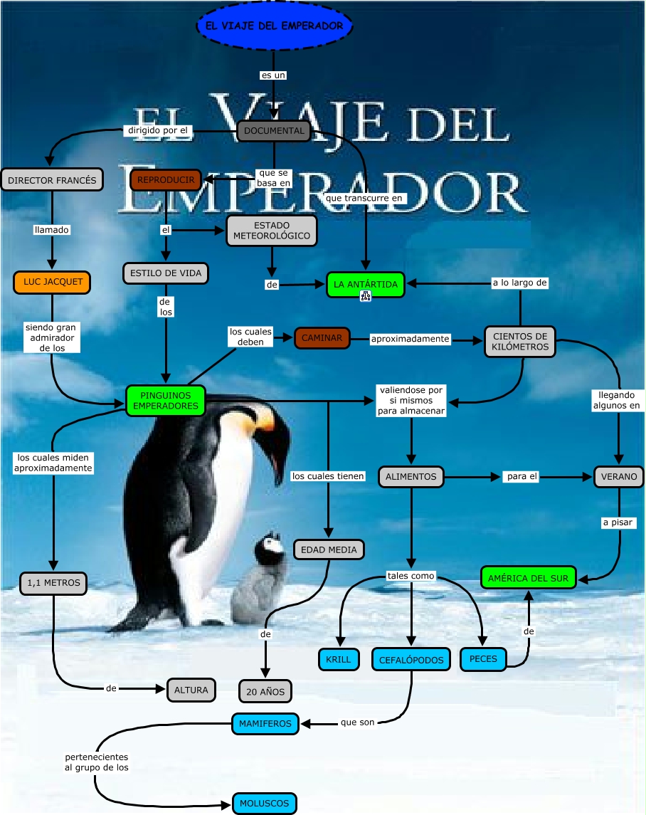 el viaje del emperador, ALIMENTOS tales como PECES, PINGUINOS EMPERADORES los cuales tienen EDAD MEDIA, ESTILO DE VIDA de los PINGUINOS EMPERADORES, REPRODUCIR el ESTILO DE VIDA, ALIMENTOS para el VERANO, CIENTOS DE KILÓMETROS valiendose por si mismos para almacenar ALIMENTOS, CAMINAR aproximadamente CIENTOS DE KILÓMETROS, PINGUINOS EMPERADORES los cuales deben CAMINAR, REPRODUCIR el ESTADO METEOROLÓGICO, CEFALÓPODOS que son MAMIFEROS