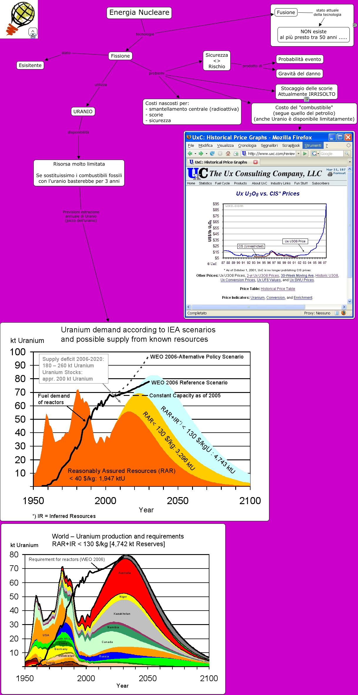 EnergiaNucleare, Fissione problemi Costo del "combustibile" (segue quello del petrolio) (anche Uranio è disponibile limitatamente), URANIO disponibilità Risorsa molto limitata Se sostituissimo i combustibili fossili con l'uranio basterebbe per 3 anni, Fissione stato Esisitente, Costo del "combustibile" (segue quello del petrolio) (anche Uranio è disponibile limitatamente) , Sicurezza <> Rischio prodotto di Gravità del danno, Fissione problemi Costi nascosti per: - smantellamento centrale (radioattiva) - scorie - sicurezza, Fissione problemi Sicurezza <> Rischio, Energia Nucleare tecnologie Fissione, Fissione utilizza URANIO, Risorsa molto limitata Se sostituissimo i combustibili fossili con l'uranio basterebbe per 3 anni Previsioni estrazione annuale di Uranio (picco dell'uranio)