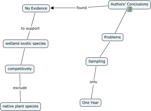 author conclusions, competitively exclude native plant species, No Evidence to support wetland exotic species, wetland exotic species competitively, Problems Sampling, Authors' Conclusions Problems, Sampling only One Year, Authors' Conclusions found No Evidence