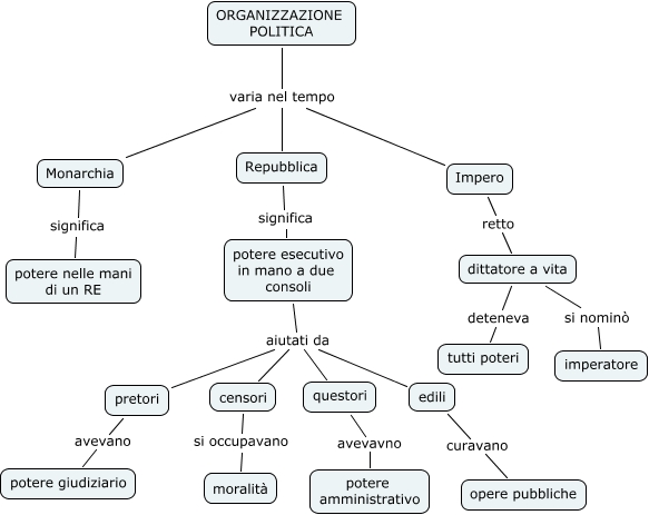 organizzazione politica, Repubblica significa potere esecutivo in mano a due consoli, potere esecutivo in mano a due consoli aiutati da censori, censori si occupavano moralità, potere esecutivo in mano a due consoli aiutati da edili, potere esecutivo in mano a due consoli aiutati da pretori, pretori avevano potere giudiziario, Monarchia significa potere nelle mani di un RE, potere esecutivo in mano a due consoli aiutati da questori, Impero retto dittatore a vita, ORGANIZZAZIONE POLITICA varia nel tempo Impero