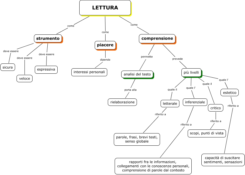 Mappa_lettura, comprensione prevede più livelli, inferenziale riferito a rapporti fra le informazioni, collegamenti con le conoscenze personali, comprensione di parole dal contesto, critico riferito a scopi, punti di vista, LETTURA come comprensione, comprensione permette analisi del testo, strumento deve essere sicura, piacere dipende interessi personali, strumento deve essere veloce, più livelli quale il letterale, più livelli quale l' estetico