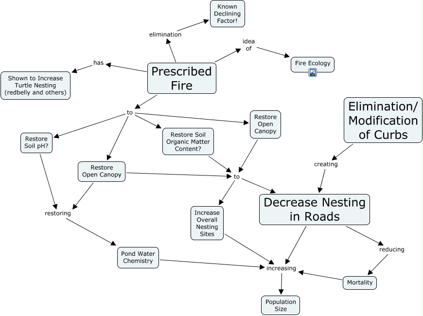 Suggested Conservation Strategies, Restore Soil pH? restoring Pond Water Chemistry, Elimination/ Modification of Curbs creating Decrease Nesting in Roads, Decrease Nesting in Roads reducing Mortality, Prescribed Fire to Restore Open Canopy, Prescribed Fire elimination Known Declining Factor!, Prescribed Fire to Restore Soil pH?, Increase Overall Nesting Sites increasing Population Size, Restore Open Canopy restoring Pond Water Chemistry, Restore Open Canopy to Decrease Nesting in Roads, Prescribed Fire to Restore Soil Organic Matter Content?