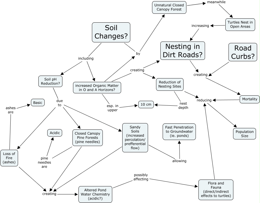 Suggested Factors, Loss of Fire (ashes) ashes are Basic, Nesting in Dirt Roads? creating Mortality, Reduction of Nesting Sites nest depth 10 cm, increased Organic Matter in O and A Horizons? esp. in upper 10 cm, Sandy Soils (increased percolation/ prefferential flow) allowing Fast Penetration to Groundwater (ie. ponds), Loss of Fire (ashes) creating Altered Pond Water Chemistry (acidic?), increased Organic Matter in O and A Horizons? creating Nesting in Dirt Roads?, Unnatural Closed Canopy Forest meanwhile Turtles Nest in Open Areas, Road Curbs? creating Mortality, Reduction of Nesting Sites reducing Population Size