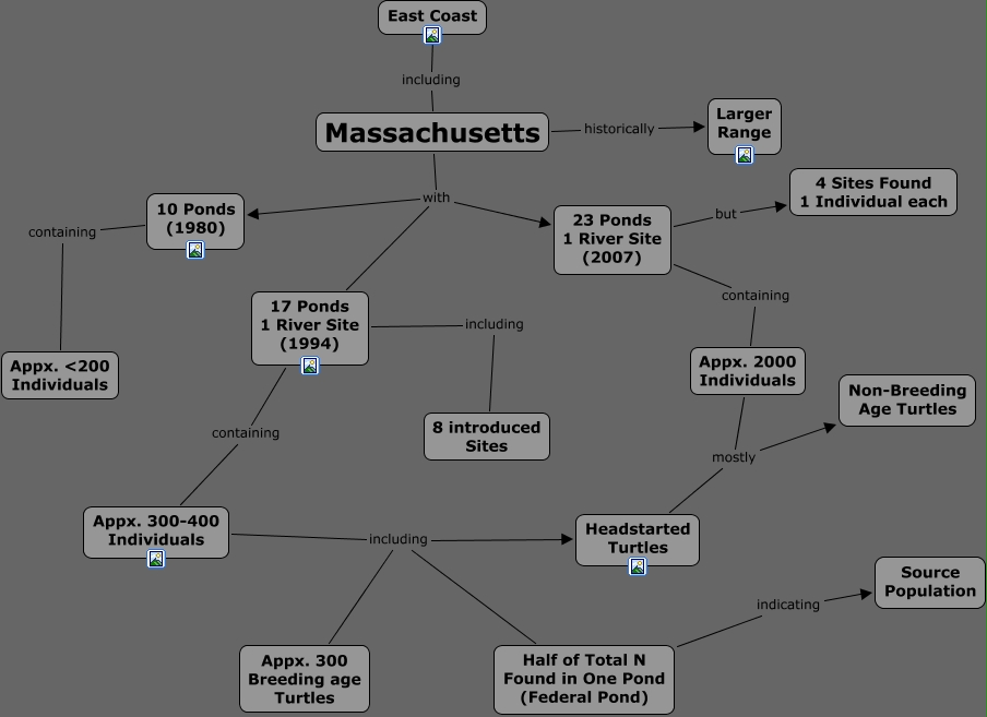 Population Status, Massachusetts with 10 Ponds (1980), Appx. 300-400 Individuals including Half of Total N Found in One Pond (Federal Pond), Massachusetts with 17 Ponds 1 River Site (1994), 23 Ponds 1 River Site (2007) but 4 Sites Found 1 Individual each, East Coast including Massachusetts, 17 Ponds 1 River Site (1994) containing Appx. 300-400 Individuals, Appx. 300-400 Individuals including Headstarted Turtles, 10 Ponds (1980) containing Appx. Individuals, Appx. 2000 Individuals mostly Headstarted Turtles, Appx. 2000 Individuals mostly Non-Breeding Age Turtles