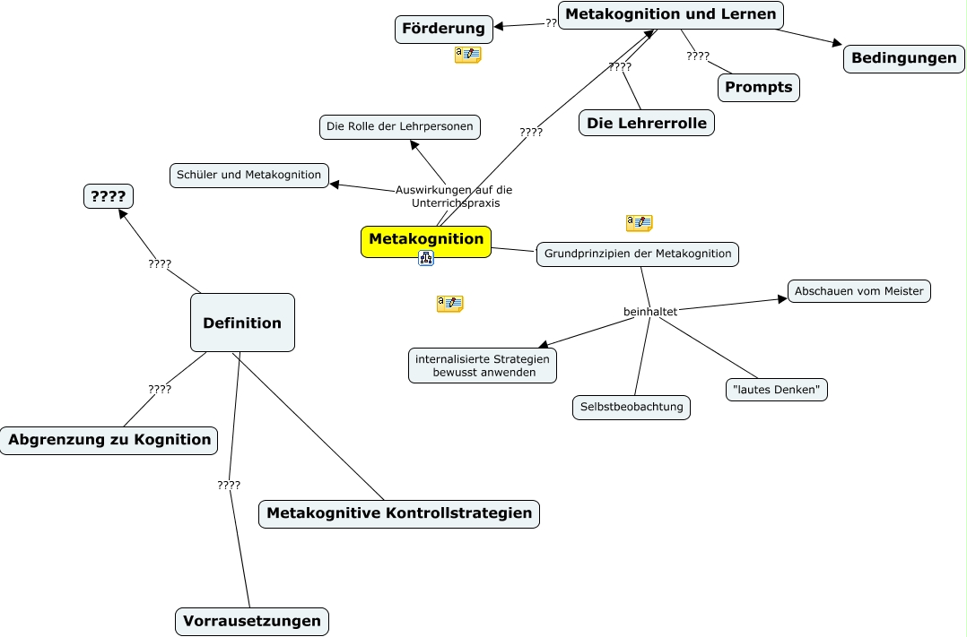 Dieses mit IHMC CmapTools erstellte CMap hat Informationen bezüglich: Metakognition, Definition ???? Vorrausetzungen, Grundprinzipien der Metakognition beinhaltet internalisierte Strategien bewusst anwenden, Metakognition Auswirkungen auf die Unterrichspraxis Die Rolle der Lehrpersonen, Grundprinzipien der Metakognition beinhaltet "lautes Denken", Metakognition und Lernen ???? Prompts, Metakognition Auswirkungen auf die Unterrichspraxis Schüler und Metakognition, Grundprinzipien der Metakognition beinhaltet Abschauen vom Meister, Metakognition und Lernen ???? Bedingungen, Definition ???? Abgrenzung zu Kognition, Metakognition ???? Metakognition und Lernen, Metakognition und Lernen ???? Die Lehrerrolle, Metakognition ???? Grundprinzipien der Metakognition, Metakognition und Lernen ???? Förderung, Definition ???? ????, Definition ???? Metakognitive Kontrollstrategien, Grundprinzipien der Metakognition beinhaltet Selbstbeobachtung
