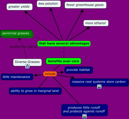 Diverse Grasses, perennial grasses that have several advantages greater yields, perennial grasses that have several advantages fewer greenhouse gases, perennial grasses that have several advantages benefits over corn, benefits over corn include little maintenance, Diverse Grasses involve the use of perennial grasses, perennial grasses that have several advantages less polution, benefits over corn include produces little runoff and protects against runoff, benefits over corn include ability to grow in marginal land, benefits over corn include massive root systems store carbon, benefits over corn include provide habitat