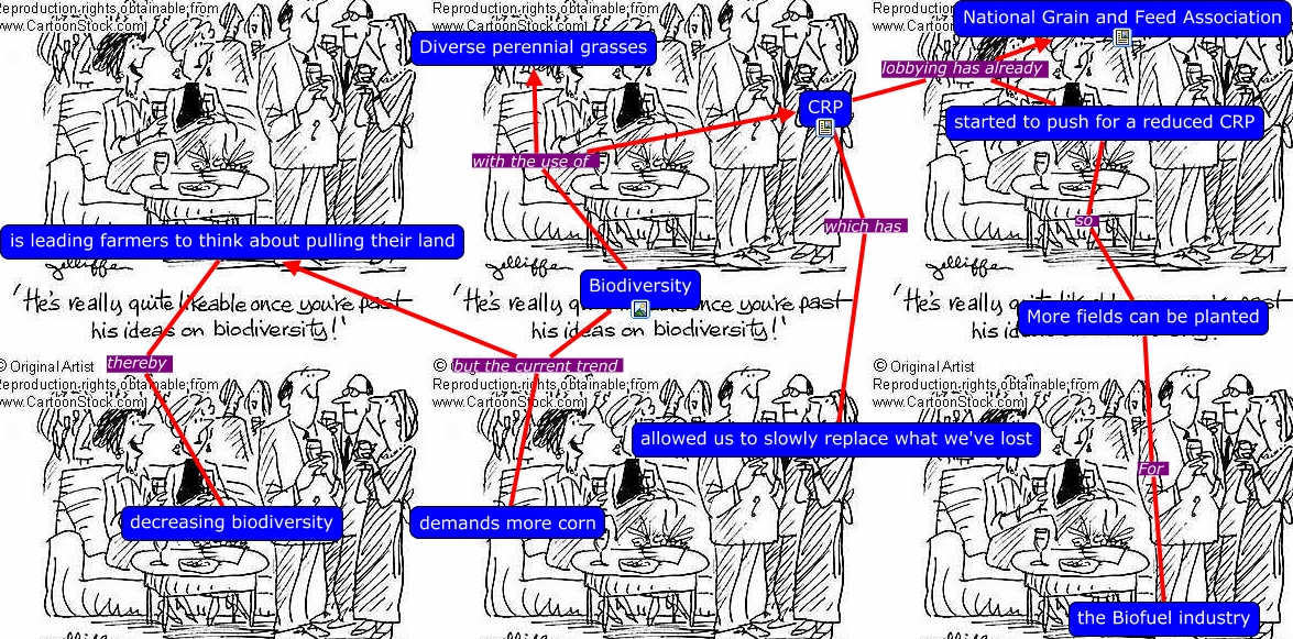 Biodiversity, Biodiversity with the use of Diverse perennial grasses, is leading farmers to think about pulling their land thereby decreasing biodiversity, Biodiversity with the use of CRP, CRP which has allowed us to slowly replace what we've lost, CRP lobbying has already National Grain and Feed Association, Biodiversity but the current trend demands more corn, CRP lobbying has already started to push for a reduced CRP, More fields can be planted For the Biofuel industry, Biodiversity but the current trend is leading farmers to think about pulling their land, started to push for a reduced CRP so More fields can be planted