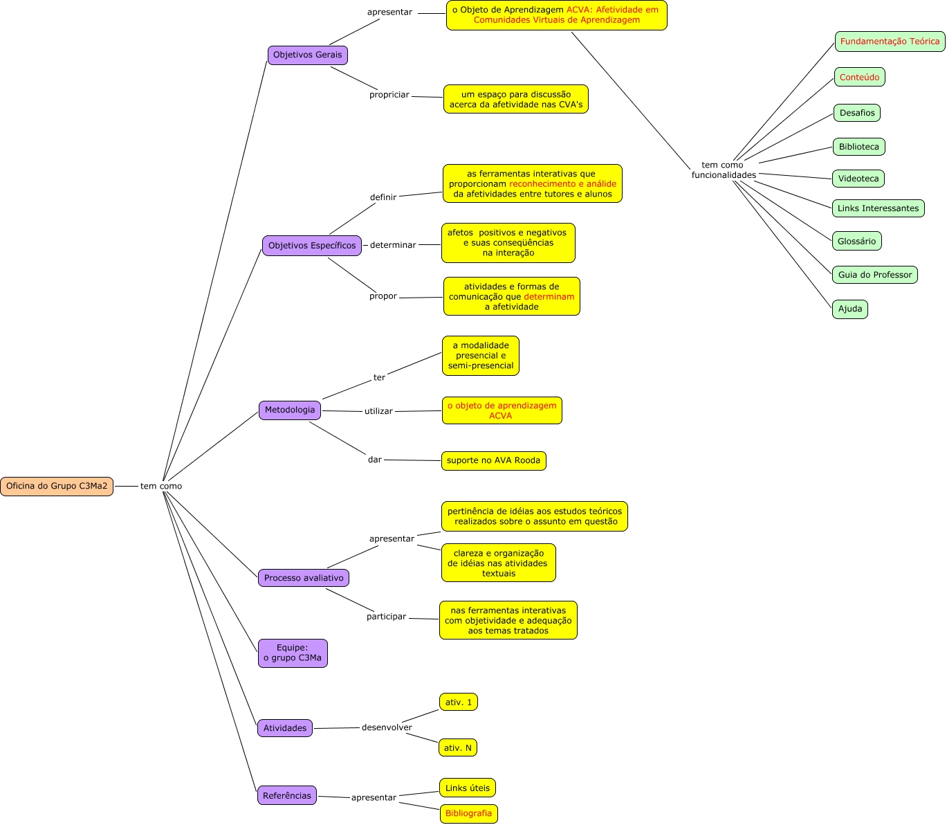 ObjetoV4Impressao, Oficina do Grupo C3Ma2 tem como Atividades, o Objeto de Aprendizagem ACVA: Afetividade em Comunidades Virtuais de Aprendizagem tem como funcionalidades Conteúdo, Objetivos Gerais apresentar o Objeto de Aprendizagem ACVA: Afetividade em Comunidades Virtuais de Aprendizagem, Objetivos Específicos determinar afetos positivos e negativos e suas conseqüências na interação, Objetivos Específicos propor atividades e formas de comunicação que determinam a afetividade, Oficina do Grupo C3Ma2 tem como Referências, Oficina do Grupo C3Ma2 tem como Metodologia, Processo avaliativo participar nas ferramentas interativas com objetividade e adequação aos temas tratados, Processo avaliativo apresentar clareza e organização de idéias nas atividades textuais, Oficina do Grupo C3Ma2 tem como Processo avaliativo