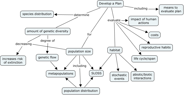 Conservation Plan, population distribution SLOSS, habitat SLOSS, Develop a Plan for population size, Develop a Plan including means to evaluate plan, population size SLOSS, amount of genetic diversity degree of genetic flow, habitat abiotic/biotic interactions, Develop a Plan evaluate costs, Develop a Plan evaluate life cycle/span, amount of genetic diversity decreasing increases risk of extinction