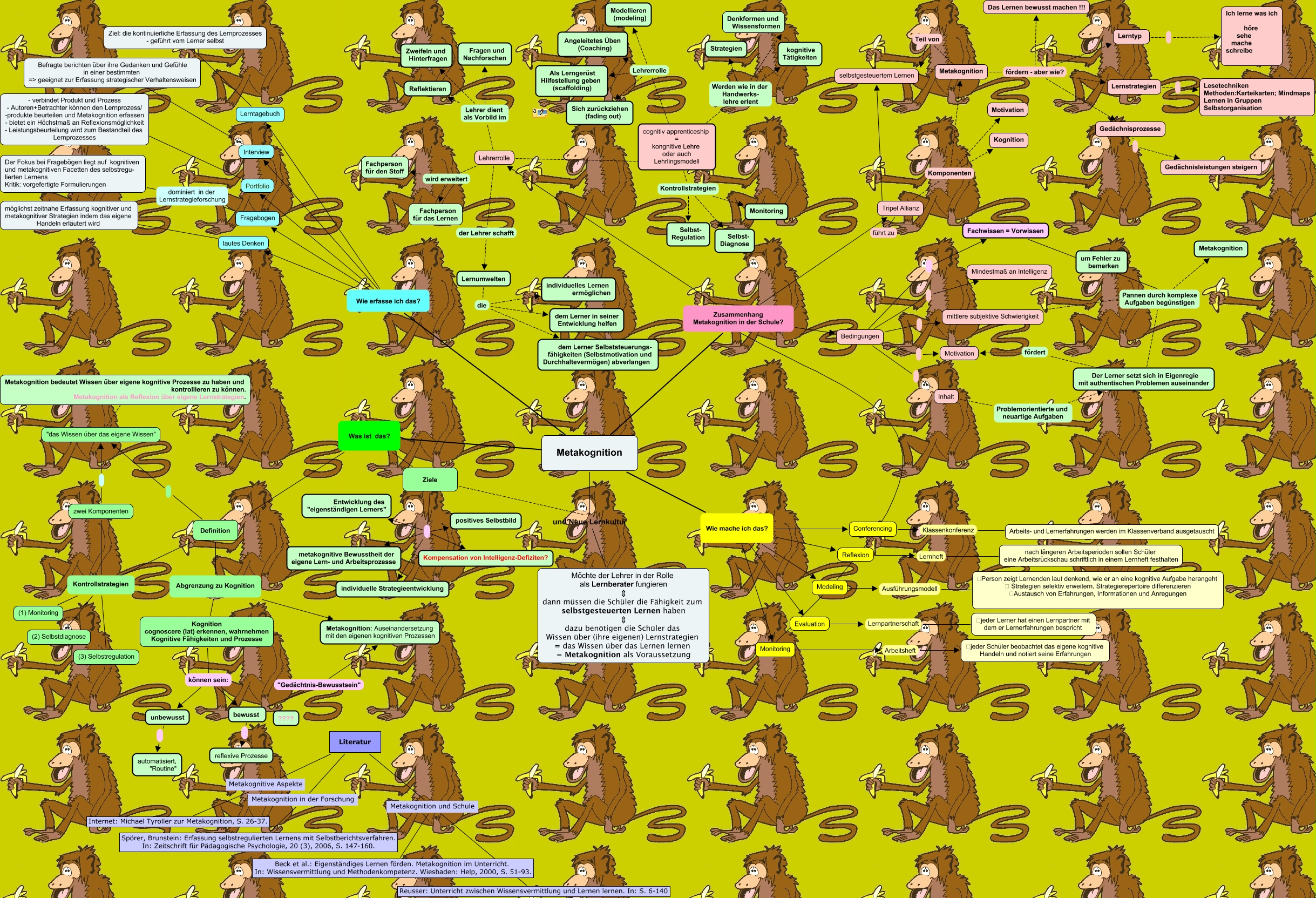 Dieses mit IHMC CmapTools erstellte CMap hat Informationen bezüglich: Metakognition2, Literatur Metakognitive Aspekte Internet: Michael Tyroller zur Metakognition, S. 26-37., Monitoring Zusammenhang Metakognition in der Schule? Bedingungen, Definition Kontrollstrategien (1) Monitoring, Metakognition Wie mache ich das? Monitoring, Kognition cognoscere (lat) erkennen, wahrnehmen Kognitive Fähigkeiten und Prozesse können sein: unbewusst, Ziele individuelle Strategieentwicklung, lautes Denken ???? möglichst zeitnahe Erfassung kognitiver und metakognitiver Strategien indem das eigene Handeln erläutert wird, Definition Kontrollstrategien (2) Selbstdiagnose, Bedingungen Mindestmaß an Intelligenz, Lehrerrolle Lehrer dient als Vorbild im Reflektieren, Metakognition Zusammenhang Metakognition in der Schule? Tripel Allianz, Lehrerrolle wird erweitert Fachperson für den Stoff, Monitoring Zusammenhang Metakognition in der Schule? Tripel Allianz, Lehrerrolle Lehrer dient als Vorbild im Zweifeln und Hinterfragen, zwei Komponenten Kontrollstrategien (1) Monitoring, Inhalt Problemorientierte und neuartige Aufgaben Der Lerner setzt sich in Eigenregie mit authentischen Problemen auseinander, cognitiv apprenticeship = kongnitive Lehre oder auch Lehrlingsmodell Lehrerrolle Sich zurückziehen (fading out), cognitiv apprenticeship = kongnitive Lehre oder auch Lehrlingsmodell Werden wie in der Handwerks- lehre erlent kognitive Tätigkeiten, Bedingungen Fachwissen = Vorwissen, Gedächnisprozesse Gedächnisleistungen steigern