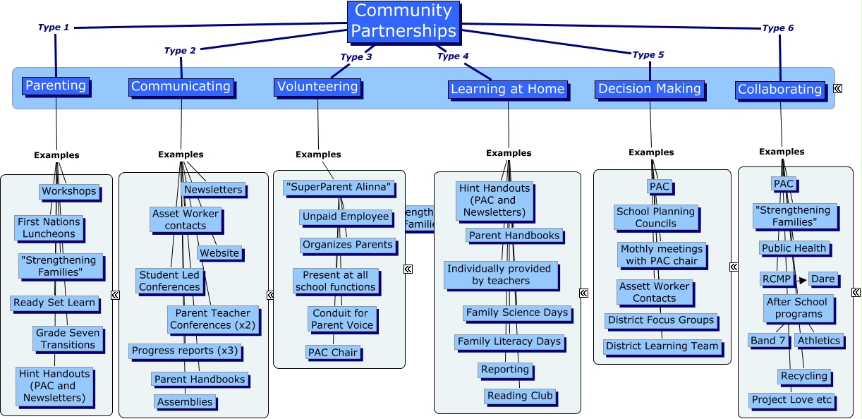 Community, Collaborating Examples RCMP, Learning at Home Examples Reporting, Parenting Examples Grade Seven Transitions, Community Partnerships Type 5 Decision Making, Communicating Examples Progress reports (x3), RCMP ???? Dare, Communicating Examples Parent Teacher Conferences (x2), Communicating Examples Assemblies, "SuperParent Alinna" PAC Chair, After School programs Athletics
