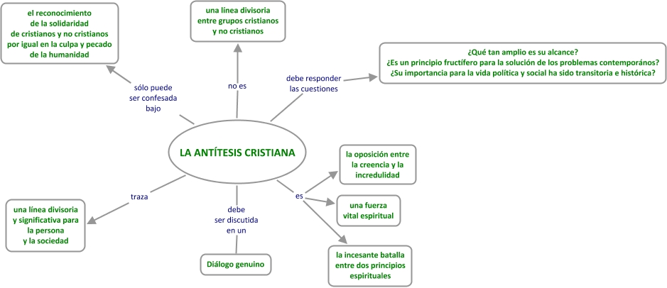 Este mapa conceptual tiene información relacionada a: La Antítesis Cristiana, LA ANTÍTESIS CRISTIANA debe responder las cuestiones ¿Qué tan amplio es su alcance? ¿Es un principio fructífero para la solución de los problemas contemporános? ¿Su importancia para la vida política y social ha sido transitoria e histórica?, LA ANTÍTESIS CRISTIANA es la incesante batalla entre dos principios espirituales, LA ANTÍTESIS CRISTIANA es la oposición entre la creencia y la incredulidad, LA ANTÍTESIS CRISTIANA es una fuerza vital espiritual, LA ANTÍTESIS CRISTIANA traza una línea divisoria y significativa para la persona y la sociedad, LA ANTÍTESIS CRISTIANA sólo puede ser confesada bajo el reconocimiento de la solidaridad de cristianos y no cristianos por igual en la culpa y pecado de la humanidad, LA ANTÍTESIS CRISTIANA no es una línea divisoria entre grupos cristianos y no cristianos, LA ANTÍTESIS CRISTIANA debe ser discutida en un Diálogo genuino