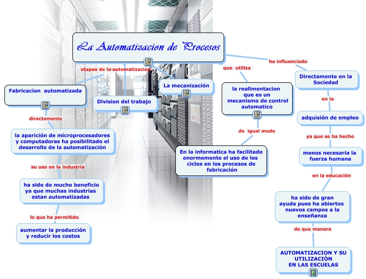 Este Cmap, tiene información relacionada con: automatización, adquisión de empleo ya que se ha hecho menos necesaria la fuerza humana, La Automatizacion de Procesos etapas de la automatizacion Fabricacion automatizada, menos necesaria la fuerza humana en la educación ha sido de gran ayuda pues ha abiertos nuevos campos a la enseñanza, Directamente en la Sociedad en la adquisión de empleo, Fabricacion automatizada directamente la aparición de microprocesadores y computadoras ha posibilitado el desarrollo de la automatización, la realimentacion que es un mecanismo de control automatico de igual modo En la informatica ha facilitado enormemente el uso de los ciclos en los procesos de fabricación, ha sido de gran ayuda pues ha abiertos nuevos campos a la enseñanza de que manera AUTOMATIZACION Y SU UTILIZACIÓN EN LAS ESCUELAS, La Automatizacion de Procesos que utiliza la realimentacion que es un mecanismo de control automatico, La Automatizacion de Procesos ???? Division del trabajo, La Automatizacion de Procesos ???? La mecanización, La Automatizacion de Procesos ha influenciado Directamente en la Sociedad, ha sido de mucho beneficio ya que muchas industrias estan automatizadas lo que ha permitido aumentar la producción y reducir los costos, la aparición de microprocesadores y computadoras ha posibilitado el desarrollo de la automatización su uso en la industria ha sido de mucho beneficio ya que muchas industrias estan automatizadas