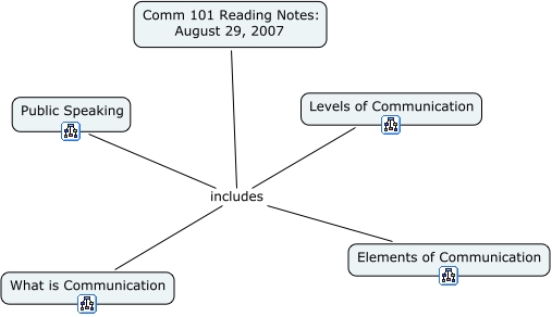 This Concept Map has information related to: Reading Notes 8-29, Comm 101 Reading Notes: August 29, 2007 includes Levels of Communication, Comm 101 Reading Notes: August 29, 2007 includes Public Speaking, Comm 101 Reading Notes: August 29, 2007 includes What is Communication, Comm 101 Reading Notes: August 29, 2007 includes Elements of Communication