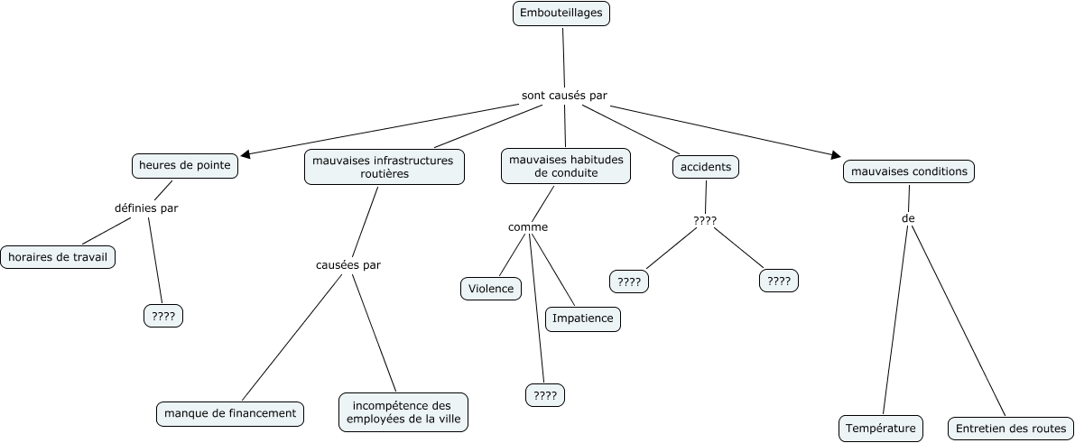 This Concept Map has information related to: Carte embouteillages, mauvaises infrastructures routières causées par manque de financement, mauvaises conditions de Entretien des routes, Embouteillages sont causés par heures de pointe, Embouteillages sont causés par mauvaises habitudes de conduite, heures de pointe définies par ????, accidents ???? ????, mauvaises habitudes de conduite comme Impatience, Embouteillages sont causés par mauvaises infrastructures routières, mauvaises habitudes de conduite comme ????, heures de pointe définies par horaires de travail