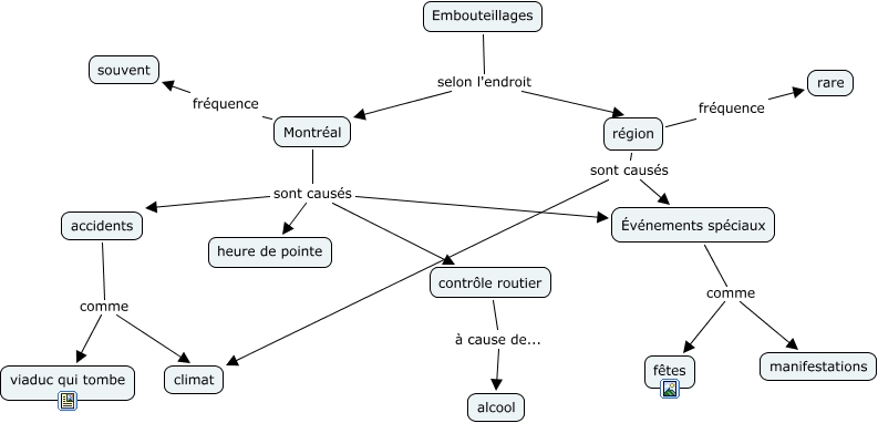This Concept Map has information related to: carteK, région sont causés Événements spéciaux, Montréal sont causés accidents, accidents comme climat, Montréal sont causés heure de pointe, Montréal fréquence souvent, Montréal sont causés contrôle routier, Montréal sont causés Événements spéciaux, accidents comme viaduc qui tombe, Embouteillages selon l'endroit région, Événements spéciaux comme fêtes