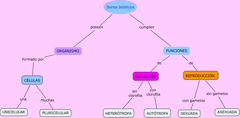 Este mapa conceptual tiene información relacionada a: seres vivos, ORGANISMO formado por CÉLULAS, FUNCIONES de REPRODUCCIÓN, Seres bióticos cumplen FUNCIONES, FUNCIONES de NUTRICIÓN, NUTRICIÓN con clorofila AUTÓTROFA, Seres bióticos poseen ORGANISMO, REPRODUCCIÓN sin gametos ASEXUADA, REPRODUCCIÓN con gametos SEXUADA, NUTRICIÓN sin clorofila HETERÓTROFA, CÉLULAS muchas PLURICELULAR