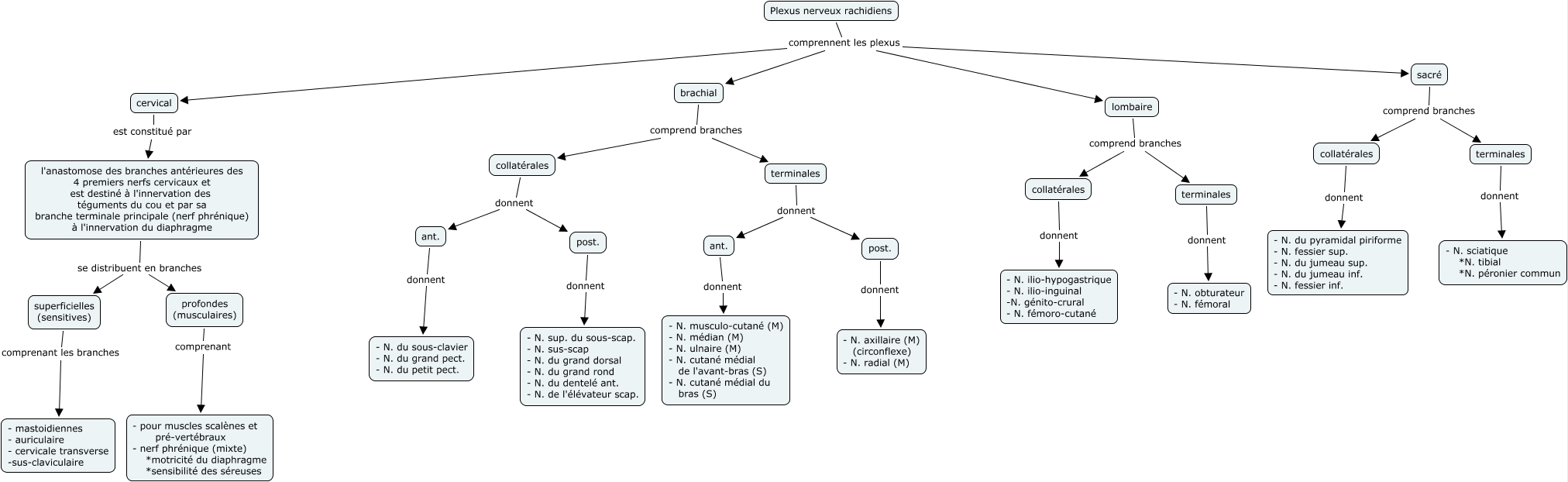This Concept Map has information related to: plexus nerveux rachidiens, terminales donnent - N. sciatique *N. tibial *N. péronier commun, superficielles (sensitives) comprenant les branches - mastoidiennes - auriculaire - cervicale transverse -sus-claviculaire, Plexus nerveux rachidiens comprennent les plexus cervical, brachial comprend branches collatérales, cervical est constitué par l'anastomose des branches antérieures des 4 premiers nerfs cervicaux et est destiné à l'innervation des téguments du cou et par sa branche terminale principale (nerf phrénique) à l'innervation du diaphragme, sacré comprend branches collatérales, profondes (musculaires) comprenant - pour muscles scalènes et pré-vertébraux - nerf phrénique (mixte) *motricité du diaphragme *sensibilité des séreuses, terminales donnent ant., lombaire comprend branches collatérales, Plexus nerveux rachidiens comprennent les plexus sacré