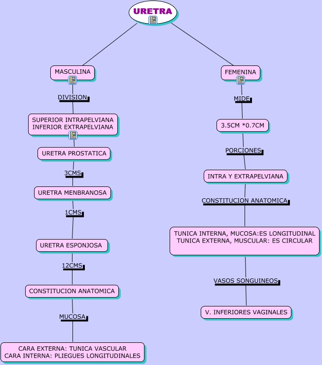 uretra, URETRA ESPONJOSA 12CMS CONSTITUCION ANATOMICA, INTRA Y EXTRAPELVIANA CONSTITUCION ANATOMICA TUNICA INTERNA, MUCOSA:ES LONGITUDINAL TUNICA EXTERNA, MUSCULAR: ES CIRCULAR, URETRA ???? FEMENINA, 3.5CM *0.7CM PORCIONES INTRA Y EXTRAPELVIANA, CONSTITUCION ANATOMICA MUCOSA CARA EXTERNA: TUNICA VASCULAR CARA INTERNA: PLIEGUES LONGITUDINALES, URETRA PROSTATICA 3CMS URETRA MENBRANOSA, TUNICA INTERNA, MUCOSA:ES LONGITUDINAL TUNICA EXTERNA, MUSCULAR: ES CIRCULAR VASOS SONGUINEOS V. INFERIORES VAGINALES, FEMENINA MIDE 3.5CM *0.7CM, URETRA ???? MASCULINA, URETRA MENBRANOSA 1CMS URETRA ESPONJOSA