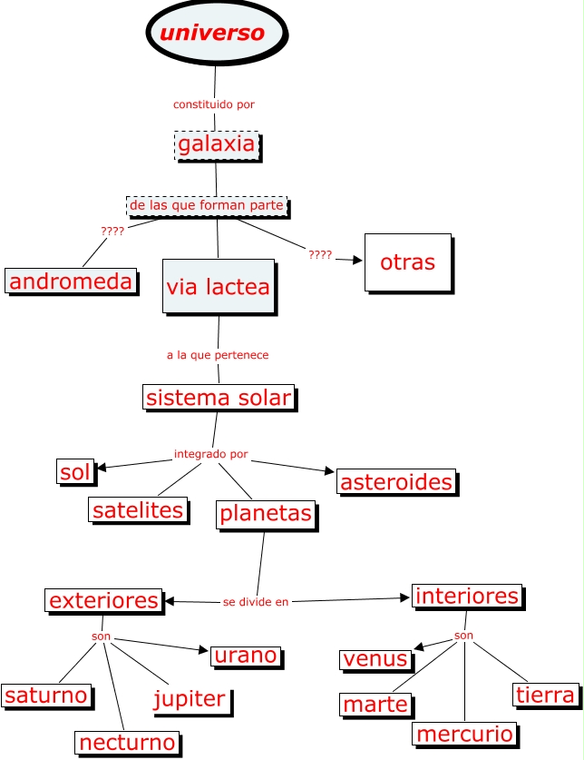 Este mapa conceptual tiene información relacionada a: alberto, interiores son marte, sistema solar integrado por satelites, exteriores son urano, de las que forman parte ???? andromeda, interiores son mercurio, sistema solar integrado por planetas, universo constituido por via lactea, planetas se divide en interiores, planetas se divide en exteriores, sistema solar integrado por asteroides