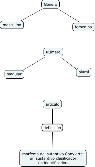 Este mapa conceptual tiene información relacionada a: genero numero y articulo, Género ???? masculino, artículo definición morfema del sutantivo.Convierte un sustantivo clasificador en identificador., Número ???? plural, Número ???? singular, Género ???? femenino