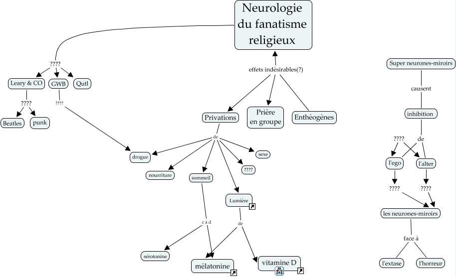 This Concept Map has information related to: Fanatisme religieux, Enthéogènes effets indésirables(?) Privations, Enthéogènes effets indésirables(?) Prière en groupe, l'ego ???? les neurones-miroirs, Leary & CO ???? punk, Enthéogènes effets indésirables(?) Neurologie du fanatisme religieux, GWB ???? drogue, les neurones-miroirs face à l'extase, Privations de ????, Privations de drogue, Leary & CO ???? Beatles