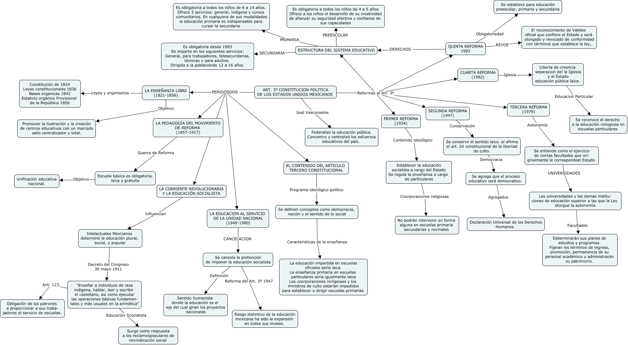 Este Cmap, tiene información relacionada con: UMANESIMO-RINASCIMENTO, Se agrega que el proceso educativo será democratico. Agregados Declaración Universal de los Derechos Humanos., ESTRUCTURA DEL SISTEMA EDUCATIVO PRIMARIA Es obligatoria a todos los niños de 6 a 14 años. Ofrece 3 servicios: general, indigena y cursos comunitarios. En cualquiera de sus modalidades la educación primaria es indispensable para cursar la secundaria, ART. 3º CONSTITUCION POLITICA DE LOS ESTADOS UNIDOS MEXICANOS Reformas al Art. 3º PRIMER REFORMA (1934), PRIMER REFORMA (1934) Contenido ideológico Establecer la educación socialista a cargo del Estado Se regula la enseñanza a cargo de particulares, Se cancela la pretención de imponer la educación socialista Reforma del Art. 3º 1947 Rasgo distintivo de la educación mexicana ha sido la expansión en todos sus niveles., ART. 3º CONSTITUCION POLITICA DE LOS ESTADOS UNIDOS MEXICANOS PERIDOSDOS EL CONTENIDO DEL ARTICULO TERCERO CONSTITUCIONAL, LA PEDAGOGÍA DEL MOVIMIENTO DE REFORMA (1857-1917) Guerra de Reforma Escuela básica es obligatoria. laica y gratuita, ART. 3º CONSTITUCION POLITICA DE LOS ESTADOS UNIDOS MEXICANOS Reformas al Art. 3º TERCERA REFORMA (1979), Se definen conceptos como democracia, nación y el sentido de lo social Caracteristicas de la enseñanza La educación impartida en escuelas oficiales sería laica La enseñanza primaria en escuelas particulares sería igualmente laica Las coorporaciones re¡ligiosas y los ministros de culto estarían impedidos para establecer o dirigir escuelas primarias, Se conservo el sentido laico. al afirma el art. 24 constitucional de la libertad de culto. Democracia Se agrega que el proceso educativo será democratico., ART. 3º CONSTITUCION POLITICA DE LOS ESTADOS UNIDOS MEXICANOS PERIDOSDOS LA ENSEÑANZA LIBRE (1821-1856), Las universidades y las demas institu- ciones de educación superior a las que la Ley otorgue la autonomía Facultades Determinarán sus planes de estudios y programas. Fijaran los términos de ingreso, promoción, permanencia de su personal académico y administrarán su patrimonio., LA EDUCACION AL SERVICIO DE LA UNIDAD NACIONAL (1940-1980) CANCELACION Se cancela la pretención de imponer la educación socialista, LA ENSEÑANZA LIBRE (1821-1856) Objetivo Promover la ilustración y la creación de centros educativos con un marcado sello centralizador y total., LA ENSEÑANZA LIBRE (1821-1856) Leyes y organismos Constitución de 1824 Leyes constitucionales 1836 Bases organicas 1842 Estatuto orgánico Provisional de la República 1856, Escuela básica es obligatoria. laica y gratuita Objetivo Unificación educativa nacional., EL CONTENIDO DEL ARTICULO TERCERO CONSTITUCIONAL Programa ideológico-político Se definen conceptos como democracia, nación y el sentido de lo social, ART. 3º CONSTITUCION POLITICA DE LOS ESTADOS UNIDOS MEXICANOS PERIDOSDOS LA EDUCACION AL SERVICIO DE LA UNIDAD NACIONAL (1940-1980), ART. 3º CONSTITUCION POLITICA DE LOS ESTADOS UNIDOS MEXICANOS Reformas al Art. 3º ESTRUCTURA DEL SISTEMA EDUCATIVO, LA CORRIENTE REVOLUCIONARIA Y LA EDUCACIÓN SOCIALISTA Influencian Intelectuales Mexicanos determinó la educación plural, social, y popular