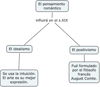 Este mapa conceptual tiene información relacionada a: hco.cultural.pensamiento romantico, El idealismo ???? Se usa la intuición. El arte es su mejor expresión., El pensamiento romántico influirá en el s.XIX El idealismo, El positivismo ???? Fué formulado por el filósofo francés August Comte., El pensamiento romántico influirá en el s.XIX El positivismo