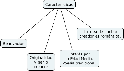 Este mapa conceptual tiene información relacionada a: características, Características ???? Renovación, Características ???? La idea de pueblo creador es romántica., Características ???? Interés por la Edad Media. Poesía tradicional., Características ???? Originalidad y genio creador