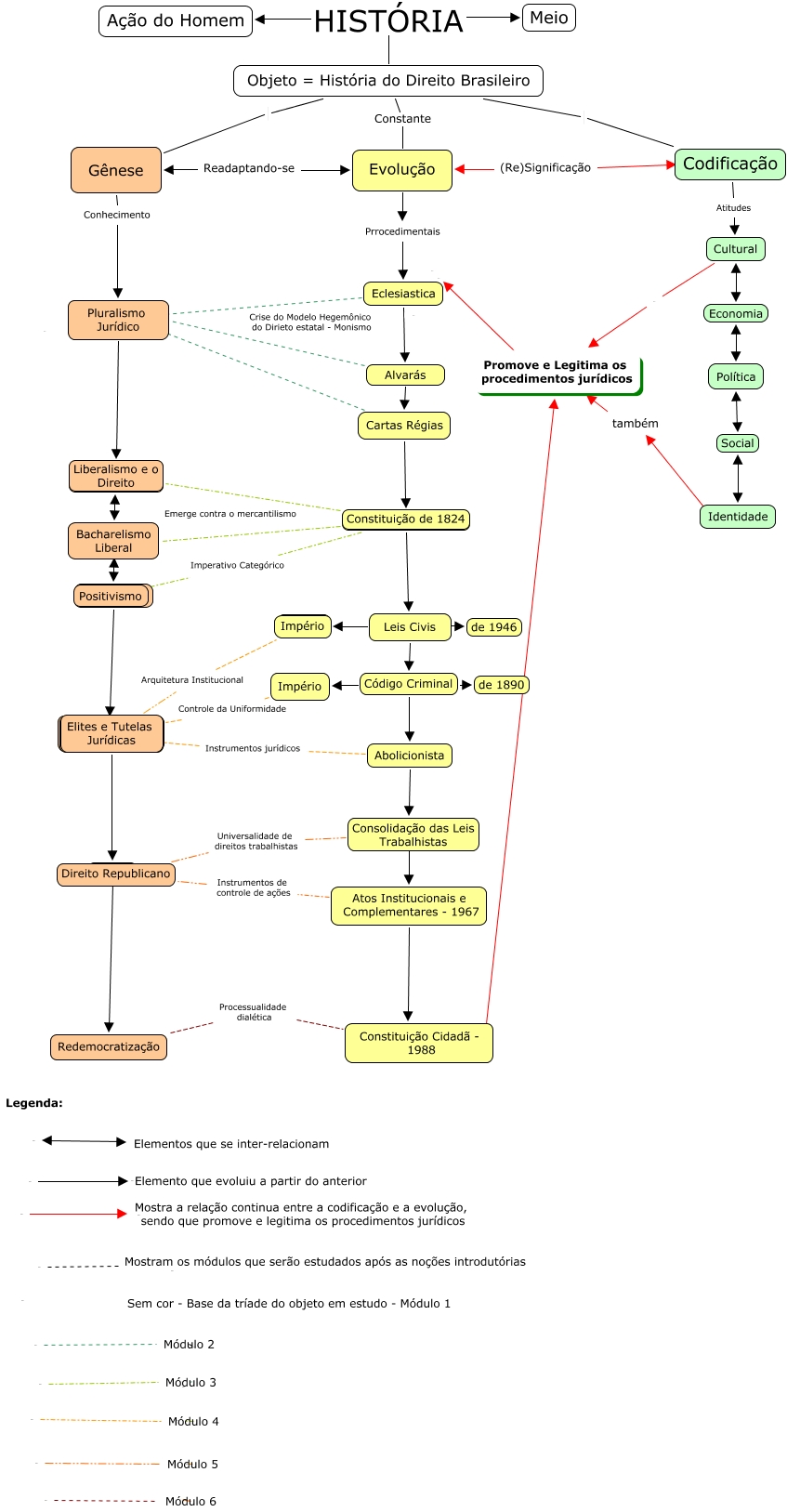 Este Mapa Conceitual tem informações relacionadas a: historia_direito_brasil, Eclesiastica Alvarás Cartas Régias, Gênese Conhecimento Pluralismo Jurídico, Positivismo Imperativo Categórico Constituição de 1824, Objeto = História do Direito Brasileiro HISTÓRIA Ação do Homem, ???? Mostra a relação continua entre a codificação e a evolução, sendo que promove e legitima os procedimentos jurídicos ????, Elites e Tutelas Jurídicas Arquitetura Institucional Império, Objeto = História do Direito Brasileiro Constante Evolução, Leis Civis Código Criminal Abolicionista, ???? ????, ???? Módulo 4 ????