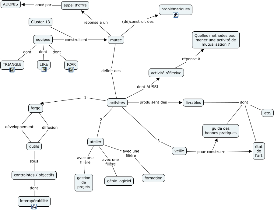 This Concept Map has information related to: mutec, activités dont AUSSI activité réflexive, atelier avec une filière génie logiciel, équipes dont TRIANGLE, équipes dont ICAR, livrables dont guide des bonnes pratiques, activités produisent des livrables, équipes dont LIRE, veille pour construire état de l'art, livrables dont état de l'art, veille pour construire guide des bonnes pratiques