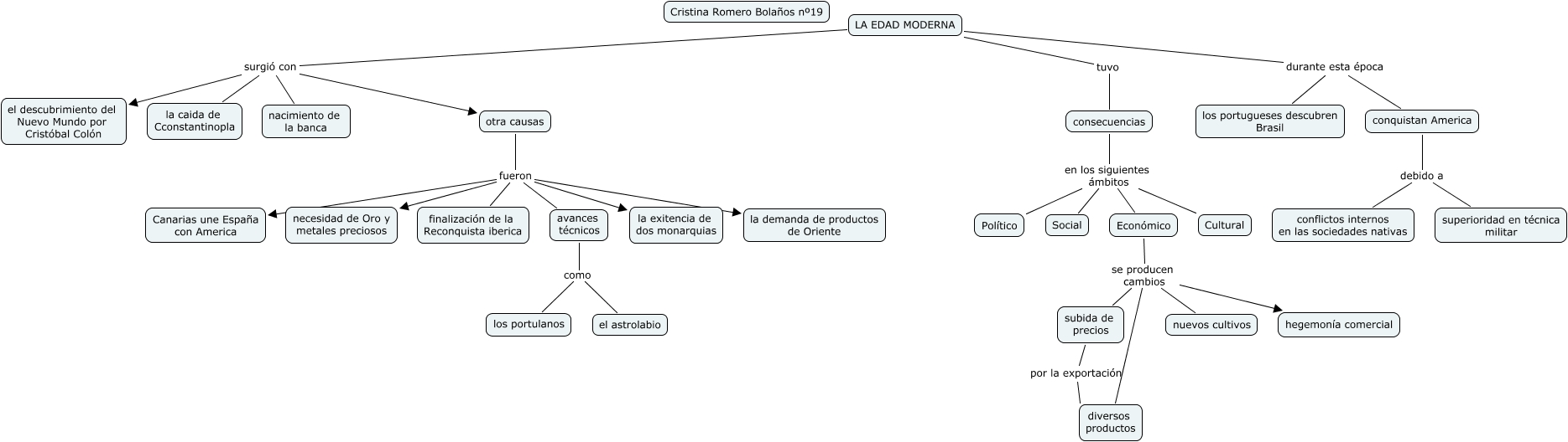 Este mapa conceptual tiene información relacionada a: 19-Cristina Romero Bolaños -edad Moderna, consecuencias en los siguientes ámbitos Económico, LA EDAD MODERNA durante esta época los portugueses descubren Brasil, LA EDAD MODERNA surgió con el descubrimiento del Nuevo Mundo por Cristóbal Colón, LA EDAD MODERNA tuvo consecuencias, LA EDAD MODERNA surgió con nacimiento de la banca, Económico se producen cambios nuevos cultivos, conquistan America debido a superioridad en técnica militar, otra causas fueron avances técnicos, Económico se producen cambios hegemonía comercial, LA EDAD MODERNA durante esta época conquistan America