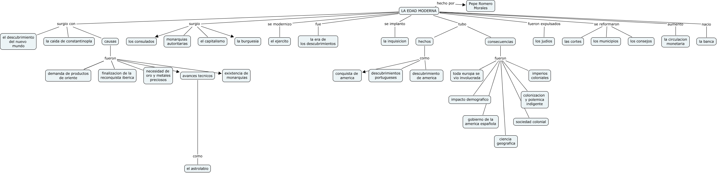 Este mapa conceptual tiene información relacionada a: 20- Pepe Romero Morales-Edad Moderna, causas fueron demanda de productos de oriente, consecuencias fueron impacto demografico, LA EDAD MODERNA se reformaron las cortes, LA EDAD MODERNA surgio el capitalismo, consecuencias fueron colonizacion y polemica indigente, consecuencias fueron toda europa se vio involucrada, LA EDAD MODERNA surgio monarquias autoritarias, hechos como descubrimiento de america, consecuencias fueron sociedad colonial, consecuencias fueron imperios coloniales