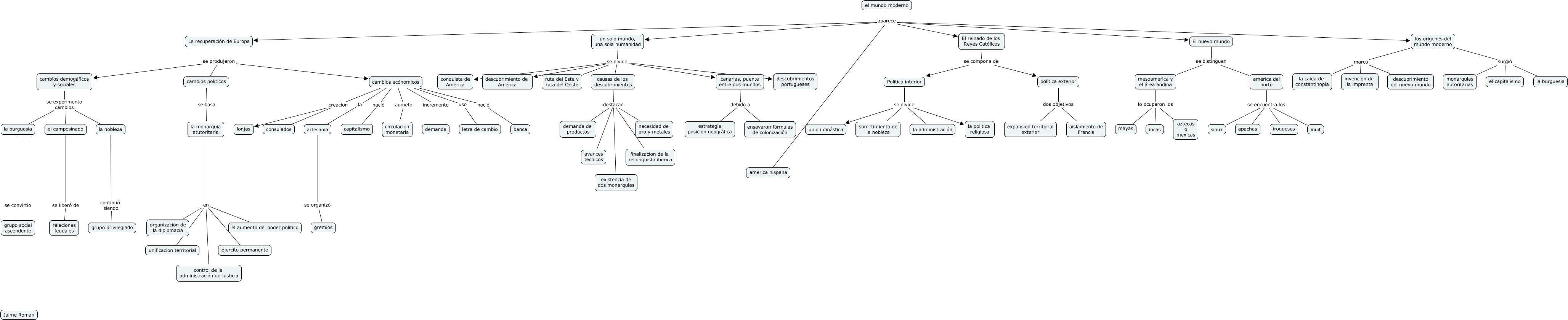 Este mapa conceptual tiene información relacionada a: 18-jaime roman ramirez- edad modernas yo soy jaime, Politica interior se divide la administración, El reinado de los Reyes Católicos se compone de Politica interior, cambios ecónomicos la artesania, los origenes del mundo moderno surgió la burguesia, La recuperación de Europa se produjeron cambios demogáficos y sociales, america del norte se encuentra los apaches, un solo mundo, una sola humanidad se divide conquista de America, causas de los descubrimientos destacan necesidad de oro y metales, un solo mundo, una sola humanidad se divide ruta del Este y ruta del Oeste, los origenes del mundo moderno marcó invencion de la imprenta