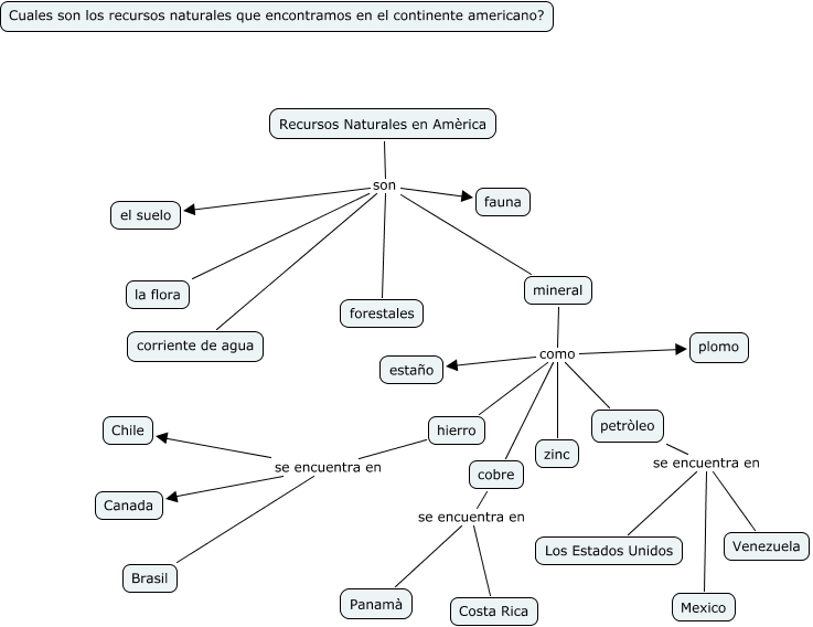 Recursos naturales en Amèrica, hierro se encuentra en Chile, hierro se encuentra en Canada, mineral como cobre, petròleo se encuentra en Venezuela, mineral como hierro, cobre se encuentra en Costa Rica, hierro se encuentra en Brasil, cobre se encuentra en Panamà, petròleo se encuentra en Los Estados Unidos, Recursos Naturales en Amèrica son mineral