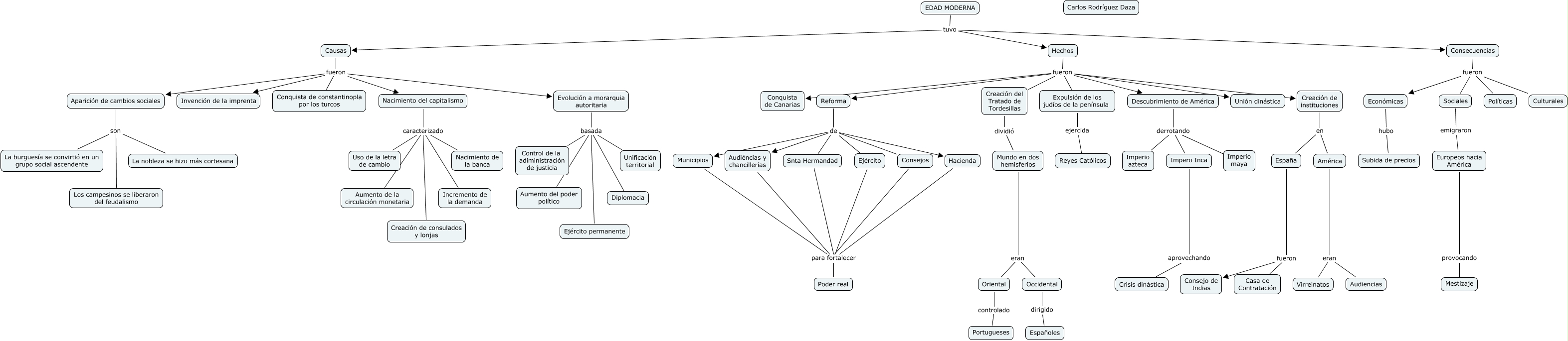 Este mapa conceptual tiene información relacionada a: 17-Carlos Rodríguez Daza-Edad Moderna, Evolución a morarquia autoritaria basada Control de la adiministración de justicia, Aparición de cambios sociales son La burguesía se convirtió en un grupo social ascendente, Nacimiento del capitalismo caracterizado Creación de consulados y lonjas, Ejército para fortalecer Poder real, Consecuencias fueron Políticas, Creación de instituciones en España, Causas fueron Nacimiento del capitalismo, Hechos fueron Unión dinástica, Hechos fueron Descubrimiento de América, América eran Audiencias, Occidental dirigido Españoles, Oriental controlado Portugueses, Expulsión de los judíos de la península ejercida Reyes Católicos, Causas fueron Conquista de constantinopla por los turcos, Creación de instituciones en América, Creación del Tratado de Tordesillas dividió Mundo en dos hemisferios, Consecuencias fueron Sociales, América eran Virreinatos, Hechos fueron Expulsión de los judíos de la península, Snta Hermandad para fortalecer Poder real