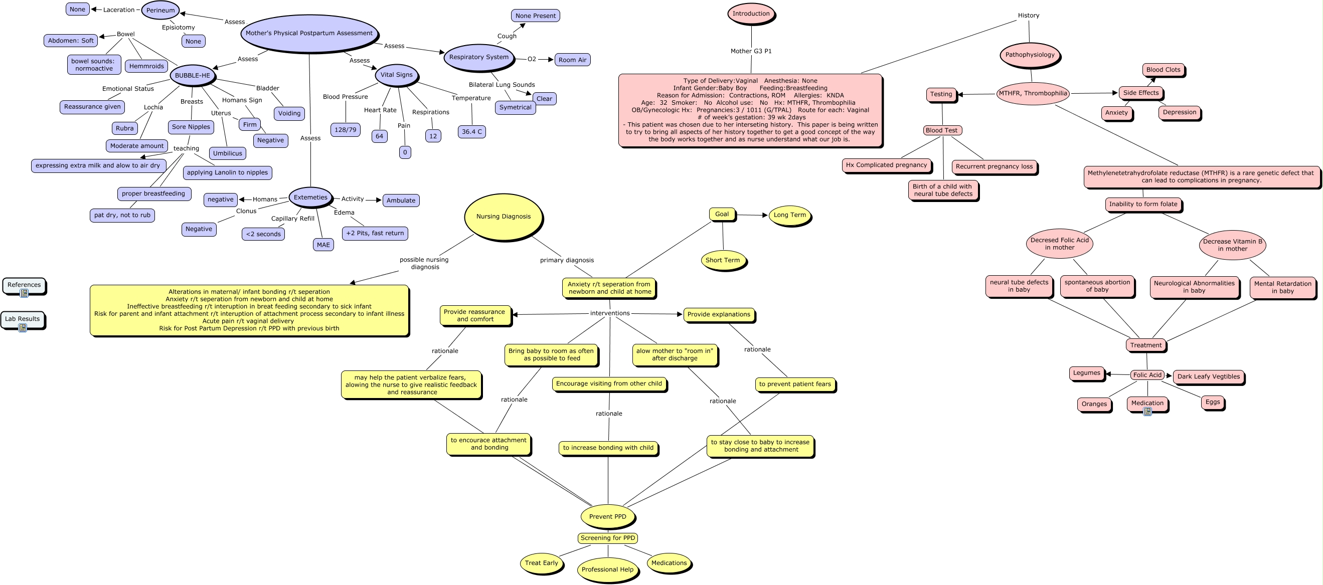 This Concept Map, created with IHMC CmapTools, has information related to: Case Study, Sore Nipples teaching applying Lanolin to nipples, Inability to form folate Decrease Vitamin B in mother Neurological Abnormalities in baby, Anxiety r/t seperation from newborn and child at home interventions alow mother to "room in" after discharge, Goal ???? Anxiety r/t seperation from newborn and child at home, to prevent patient fears ???? Prevent PPD, Testing Blood Test Birth of a child with neural tube defects, alow mother to "room in" after discharge rationale to stay close to baby to increase bonding and attachment, Pathophysiology MTHFR, Thrombophilia Side Effects, Mother's Physical Postpartum Assessment Assess BUBBLE-HE, Respiratory System Bilateral Lung Sounds Symetrical, Goal ???? Long Term, Vital Signs Heart Rate 64, Extemeties Homans negative, Treatment Folic Acid Medication, Anxiety r/t seperation from newborn and child at home interventions Encourage visiting from other child, Respiratory System O2 Room Air, to stay close to baby to increase bonding and attachment ???? Prevent PPD, BUBBLE-HE Bowel bowel sounds: normoactive, Extemeties Clonus Negative, Respiratory System Cough None Present