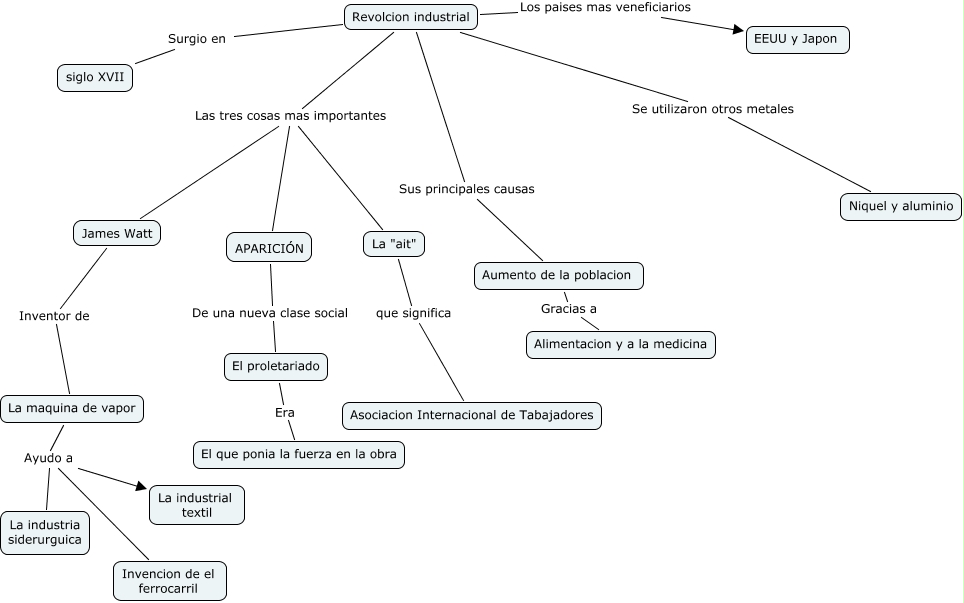 Este mapa conceptual tiene información relacionada a: 13-Carmelo Fornell Díaz, Revolcion industrial Los paises mas veneficiarios EEUU y Japon, Revolcion industrial Las tres cosas mas importantes La "ait", La maquina de vapor Ayudo a La industrial textil, James Watt Inventor de La maquina de vapor, La "ait" que significa Asociacion Internacional de Tabajadores, La maquina de vapor Ayudo a Invencion de el ferrocarril, Revolcion industrial Surgio en siglo XVII, APARICIÓN De una nueva clase social El proletariado, Revolcion industrial Sus principales causas Aumento de la poblacion, El proletariado Era El que ponia la fuerza en la obra