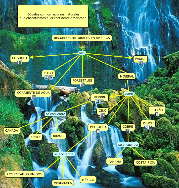 MINERALES, RECURSOS NATURALES EN AMERICA son MINERAL, RECURSOS NATURALES EN AMERICA son FORESTALES, MINERAL como COBRE, PETROLEO se encuentra MÉXICO, RECURSOS NATURALES EN AMERICA son CORRIENTE DE AGUA, RECURSOS NATURALES EN AMERICA son FLORA, RECURSOS NATURALES EN AMERICA son FAUNA, PETROLEO se encuentra VENEZUELA, MINERAL como PETROLEO, HIERRRO se encuentra CHILE