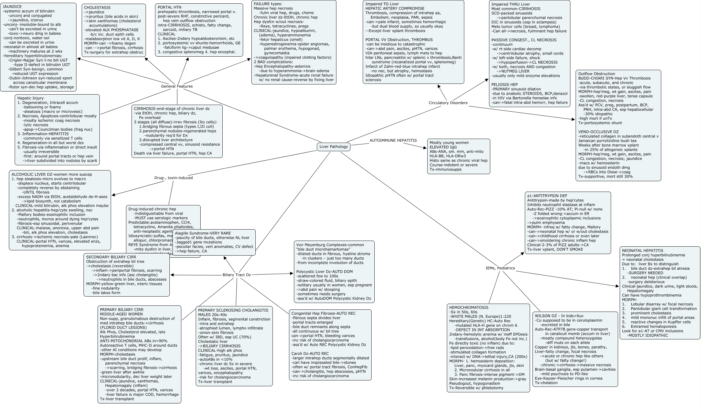 This Concept Map, created with IHMC CmapTools, has information related to: Liver Pathology I, Liver Pathology Circulatory Disorders Outflow Obstruction BUDD-CHIARI SYN-Hep Vv Thrombosis -acute, subacute, and chronic -via thrombotic states, or sluggish flow MORPH-hep’meg, wt gain, ascites, pain -swollen, red-purple liver, tense capsule -CL congestion, necrosis Ass’d w/ PCV, preg, postpartum, BCP, PNH, intra-abd CA, esp hepatocellular -30% idiopathic -high mort if unTx Tx-portosystemic shunt VENO-OCCLUSIVE DZ -reticulated collagen in subendoth central v Jamaican pyrrolizidine bush tea Weeks after bone marrow xplant -in 25% of allogeneic xplants MORPH-hep’meg, wt gain, ascites, pain -CL congestion, necrosis; jaundice -macs w/ hemosiderin due to sinusoid endoth dmg ->RBCs into Disse->coag Tx-supportive, mort still 30%, Liver Pathology Biliary Tract Dz Alagille Syndrome-VERY RARE -paucity of bile ducts, otherwise NL liver -Jagged1 gene mutations -peculiar facies, vert anomalies, CV defect ->hep failure, CA, Liver Pathology General Features CIRRHOSIS-end-stage of chronic liver dz -via EtOH, chronic hep, biliary dz, Fe overload 3 stages (all diffuse)-irrev fibrosis (Ito cells): 1.bridging fibrous septa (types I,III coll) 2.parenchymal nodules-regenerated heps -nodularity req'd for Dx 3.disrupted liver architecture -compressed central vv, sinusoid resistance ->portal HTN Death via liver failure, portal HTN, hep CA, Liver Pathology General Features JAUNDICE -systemic accum of bilirubin -unconj and conjugated ->jaundice, icterus -unconj- insoluble-bound to alb -can't be excreted in urine -toxic->neuro dmg in babies -conj-nontoxic, water-sol -can be excreted in urine -neonatal-in almost all babies -machinery matures at 2 wks -hereditary hyperbilirubinemias: -Crigler-Najjar Syn I-no bili UGT -type II-defect in bilirubin UGT -Gilbert Syn-benign, common -reduced UGT expression -Dubin-Johnson syn-reduced xport across canalicular membrane -Rotor syn-dec hep uptake, storage, Liver Pathology AUTOIMMUNE HEPATITIS Mostly young women ELEVATED IgG ABs-ANA, sm. mm, anti-mito HLA-B8, HLA-DRw3 Histo same as chronic viral hep Course-indolent or severe Tx-immunosupps, Liver Pathology General Features FAILURE types: Massive hep necrosis -fulm viral hep, drugs, chems Chronic liver dz-EtOH, chronic hep Hep dysfcn w/out necrosis- -Reye, tetracyclines, pregs CLINICAL-jaundice, hypoalbumin, (edema), hyperammonemia -fetor hepaticus (smell) -hyperestrogenemia-spider angiomas, palmar erythema, hypogonad, gynecomastia ->coagulopathy (inpaired clotting factors) 2 BAD complications: -Hep Encephalopathy-asterixis -due to hyperammonia->brain edema -Hepatorenal Syndrome-acute renal failure w/ no renal cause-reverse by fixing liver, Liver Pathology Circulatory Disorders Impaired TO Liver HEPATIC ARTERY COMPROMISE Thrombosis, compression of intrahep aa, Embolism, neoplasia, PAN, sepsis -can->pale infarct, sometimes hemorrhagic -but dual blood supply, so usually okay --Except-liver xplant thrombosis PORTAL VV Obstruction, THROMBUS -can be insidious to catastrophic -can->abd pain, ascites, pHTN, varices VIA-peritoneal sepsis, lymph mets to hep hilar LNs, pancreatitis w/ splenic v thrombosis,Banti syndrome (recanalized portal vv, splenomeg) Infarct of Zahn-red-blue intrahep infarct -no nec, but atrophy, hemostasis Idiopathic pHTN often w/ portal tract sclerosis, Liver Pathology Biliary Tract Dz PRIMARY SCLEROSING CHOLANGITIS MALES 20s-40s Inflam, fibrosis, segmental constriction -intra and extrahep -atrophied lumen, lympho infiltrate -onion-skin fibrosis Often w/ IBD, esp UC (70%) Cholestatic liver ->BILIARY CIRRHOSIS CLINICAL-high alk phos -fatigue, pruritus, jaundice -autoABs in % -chronic liver dz Sx in severe -wt loss, ascites, portal HTN, varices, encephalopathy -risk for cholangiocarcinoma Tx-liver transplant, Liver Pathology Circulatory Disorders Impaired THRU Liver Most common-CIRRHOSIS SCD-packed sinusoids ->panlobular parenchymal necrosis DIC in sinusoids (esp in eclampsia) Mets tumor cells (breast, lymphoma) -Can all->necrosis, fulminant hep failure PASSIVE CONGEST., CL NECROSIS -continuum -w/ rt-side cardiac decomp ->centrilobular atrophy, small cords -w/ left-side failure, shock ->hypoperfusion->CL NECROSIS -w/ both, necrosis AND congestion ->NUTMEG LIVER -usually only mild enzyme elevations PELIOSIS HEP -PRIMARY sinusoid dilation -due to anabolic STEROIDS, BCP,danazol -in HIV via Bartonella henselae infx -can->fatal intra-abd hemorr, hep failure, Liver Pathology Drug-, toxin-induced Drug-induced chronic hep -indistiguishable from viral -MUST use serologic markers Predictable:acetaminophen, CCl4, tetracycline, Amanita phalloides, anti-neoplastic agents, EtOH Idiosyncratic:sulfas, methyldopa, allopur, chlorpromazine, halothane REYE Syndrome-from ASA in KIDS -mito dysfcn in liver, brain ->microvesicular steatosis, Liver Pathology Drug-, toxin-induced ALCOHOLIC LIVER DZ-women more suscep 1. hep steatosis-micro evolves to macro -displace nucleus, starts centrilobular -completely reverse by abstaining -UNTIL fibrosis -excess NADH via EtOH, acetaldehyde de-H-ases ->lipid biosynth, not catabolism CLINICAL-mild bilirubin, alk phos elevation maybe 2. alcoholic hepatitis-hep/cyte swelling, nec -Mallory bodies-eosinophilic inclusion -neutrophils, monos around dying hep'cytes -fibrosis-esp sinusoidal, perivenular CLINICAL-malaise, anorexia, upper abd pain -bili, alk phos elevation, cholestasis 3. cirrhosis->ischemic necrosis-pale (Laennec) CLINICAL-portal HTN, varices, elevated enzs, hypoproteinemia, anemia, Liver Pathology IEMs, Pediatrics a1-ANTITRYPSIN DEF Antitrypsin-made by hep’cytes Inhibits neutrophil elastase at inflam Auto-Rec-PiZZ -10% AT; Pi-null w/ none -Z folded wrong->accum in ER ->eosinophilic cytoplasmic inclusions ->pulm emphysema MORPH- infreq w/ fatty change, Mallory -can->neonatal hep w/ or w/out cholestasis -can->childhood cirrhosis or even later -can->smoldering chronic inflam hep Clinical-2-3% of PiZZ 