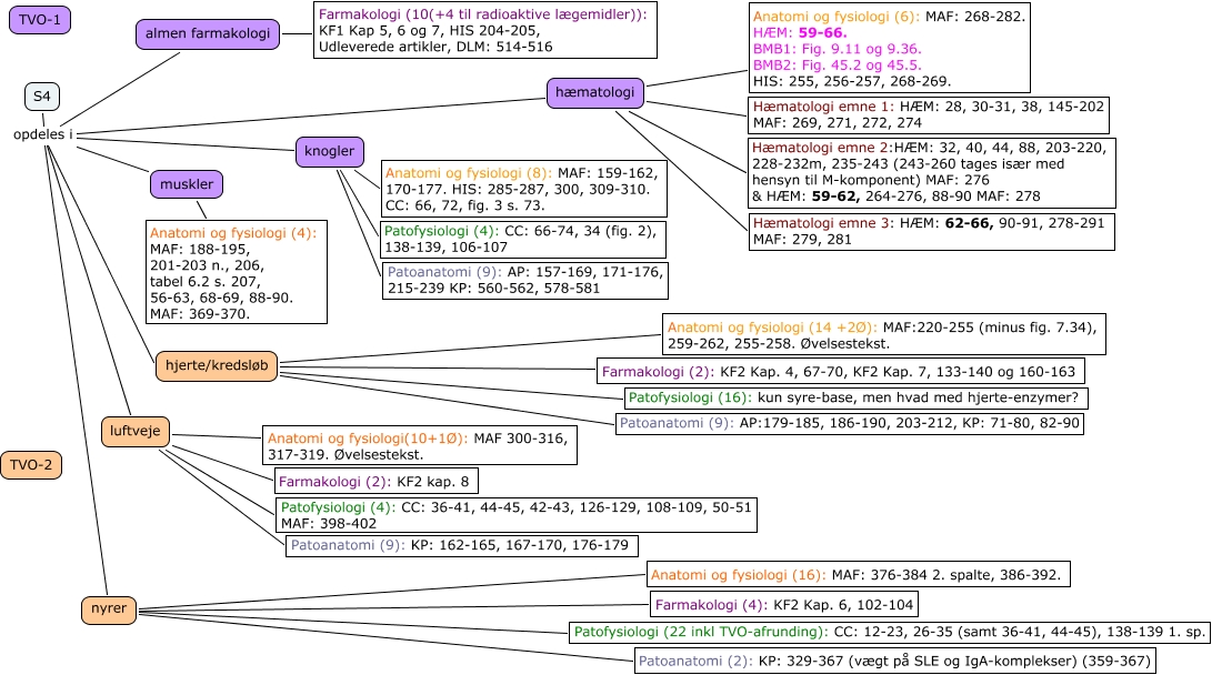 This Concept Map has information related to: S4-biofag på nettet, luftveje Anatomi og fysiologi(10+1Ø): MAF 300-316, 317-319. Øvelsestekst., nyrer Anatomi og fysiologi (16): MAF: 376-384 2. spalte, 386-392., nyrer Farmakologi (4): KF2 Kap. 6, 102-104, hjerte/kredsløb Patoanatomi (9): AP:179-185, 186-190, 203-212, KP: 71-80, 82-90, hæmatologi Hæmatologi emne 2:HÆM: 32, 40, 44, 88, 203-220, 228-232m, 235-243 (243-260 tages især med hensyn til M-komponent) MAF: 276 & HÆM: 59-62, 264-276, 88-90 MAF: 278, hæmatologi Hæmatologi emne 3: HÆM: 62-66, 90-91, 278-291 MAF: 279, 281, knogler Patoanatomi (9): AP: 157-169, 171-176, 215-239 KP: 560-562, 578-581, muskler Anatomi og fysiologi (4): MAF: 188-195, 201-203 n., 206, tabel 6.2 s. 207, 56-63, 68-69, 88-90. MAF: 369-370., hæmatologi Hæmatologi emne 1: HÆM: 28, 30-31, 38, 145-202 MAF: 269, 271, 272, 274, S4 opdeles i hæmatologi