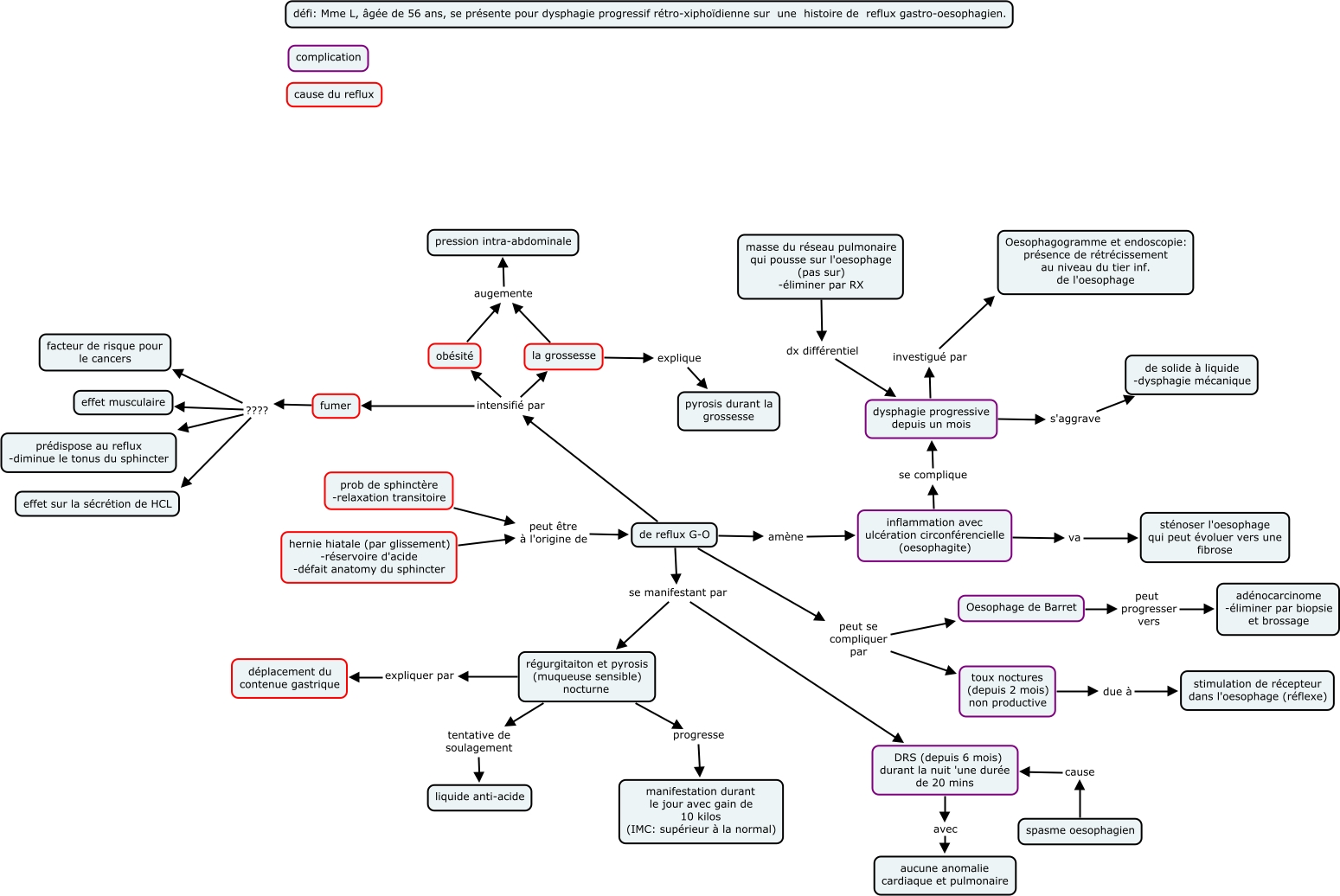 This Concept Map, created with IHMC CmapTools, has information related to: APP 1 Retour, hernie hiatale (par glissement) -réservoire d'acide -défait anatomy du sphincter peut être à l'origine de de reflux G-O, Oesophage de Barret peut progresser vers adénocarcinome -éliminer par biopsie et brossage, prob de sphinctère -relaxation transitoire peut être à l'origine de de reflux G-O, obésité augemente pression intra-abdominale, dysphagie progressive depuis un mois s'aggrave de solide à liquide -dysphagie mécanique, toux noctures (depuis 2 mois) non productive due à stimulation de récepteur dans l'oesophage (réflexe), fumer ???? effet musculaire, spasme oesophagien cause DRS (depuis 6 mois) durant la nuit 'une durée de 20 mins, inflammation avec ulcération circonférencielle (oesophagite) se complique dysphagie progressive depuis un mois, masse du réseau pulmonaire qui pousse sur l'oesophage (pas sur) -éliminer par RX dx différentiel dysphagie progressive depuis un mois, fumer ???? prédispose au reflux -diminue le tonus du sphincter, de reflux G-O intensifié par la grossesse, de reflux G-O intensifié par obésité, fumer ???? effet sur la sécrétion de HCL, la grossesse augemente pression intra-abdominale, régurgitaiton et pyrosis (muqueuse sensible) nocturne progresse manifestation durant le jour avec gain de 10 kilos (IMC: supérieur à la normal), régurgitaiton et pyrosis (muqueuse sensible) nocturne expliquer par déplacement du contenue gastrique, de reflux G-O peut se compliquer par Oesophage de Barret, la grossesse explique pyrosis durant la grossesse, de reflux G-O intensifié par fumer