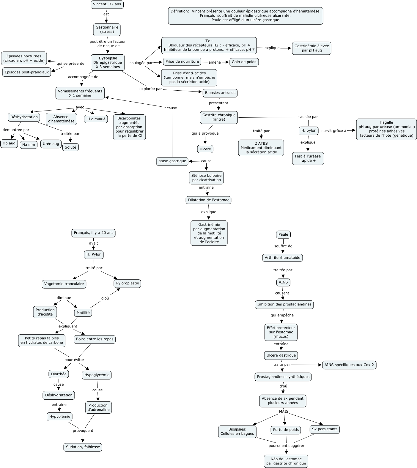 This Concept Map, created with IHMC CmapTools, has information related to: app 2 naïf, Arthrite rhumatoïde traitée par AINS, H. pylori explique Test à l'uréase rapide +, Ulcère gastrique traité par Prostaglandines synthétiques, Motilité expliquent Petits repas faibles en hydrates de carbone, H. pylori traité par 2 ATBS Médicament diminuant la sécrétion acide, Vomissements fréquents X 1 semaine avec Absence d'hématémèse, Inhibition des prostaglandines qui empêche Effet protecteur sur l'estomac (mucus), Vomissements fréquents X 1 semaine avec Bicarbonates augmentés par absorption pour réquilibrer la perte de Cl, Vincent, 37 ans est Gestionnaire (stress), Dyspepsie Dlr épigastrique X 3 semaines soulagée par Tx : Bloqueur des récepteurs H2 : - efficace, pH 4 Inhibiteur de la pompe à protons: + efficace, pH 7, AINS causent Inhibition des prostaglandines, Perte de poids pourraient suggérer Néo de l'estomac par gastrite chronique, Sx persistants pourraient suggérer Néo de l'estomac par gastrite chronique, Motilité d'oû Pyloroplastie, Absence de sx pendant plusieurs années MAIS Biospsies: Cellules en bagues, Boire entre les repas pour éviter Hypoglycémie, Effet protecteur sur l'estomac (mucus) entraîne Ulcère gastrique, Hypvolémie provoquent Sudation, faiblesse, Sténose bulbaire par cicatrisation entraîne Dilatation de l'estomac, H. pylori survit grâce à flagelle pH aug par uréase (ammoniac) protéines adhésives facteurs de l'hôte (génétique)