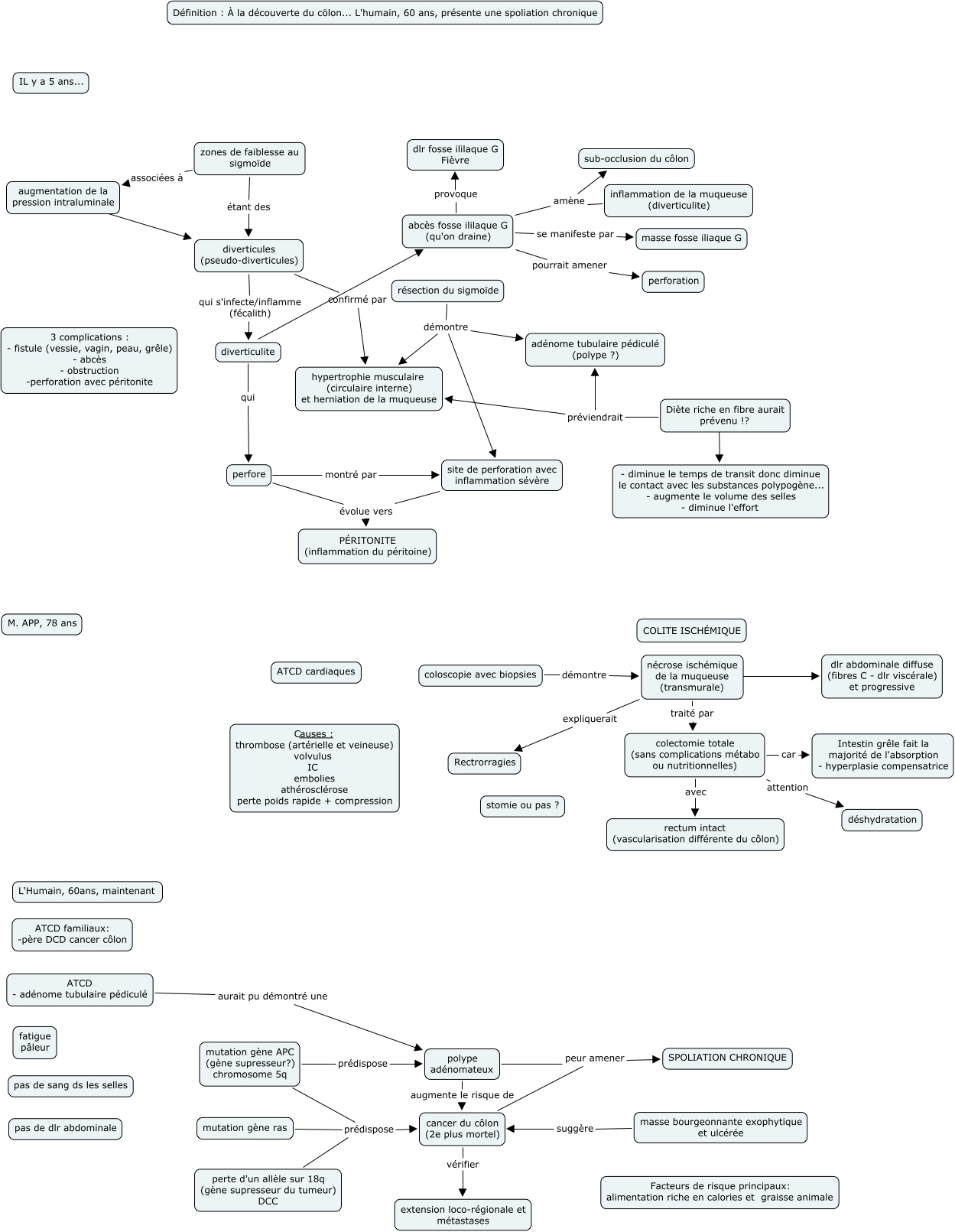 This Concept Map, created with IHMC CmapTools, has information related to: app3-naif, nécrose ischémique de la muqueuse (transmurale) expliquerait Rectrorragies, cancer du côlon (2e plus mortel) peur amener SPOLIATION CHRONIQUE, colectomie totale (sans complications métabo ou nutritionnelles) car Intestin grêle fait la majorité de l'absorption - hyperplasie compensatrice, mutation gène ras prédispose cancer du côlon (2e plus mortel), colectomie totale (sans complications métabo ou nutritionnelles) attention déshydratation, inflammation de la muqueuse (diverticulite) amène sub-occlusion du côlon, diverticulite ???? abcès fosse ililaque G (qu'on draine), Diète riche en fibre aurait prévenu !? préviendrait hypertrophie musculaire (circulaire interne) et herniation de la muqueuse, site de perforation avec inflammation sévère évolue vers PÉRITONITE (inflammation du péritoine), abcès fosse ililaque G (qu'on draine) provoque dlr fosse ililaque G Fièvre, résection du sigmoïde démontre site de perforation avec inflammation sévère, perfore évolue vers PÉRITONITE (inflammation du péritoine), abcès fosse ililaque G (qu'on draine) se manifeste par masse fosse iliaque G, augmentation de la pression intraluminale ???? diverticules (pseudo-diverticules), mutation gène APC (gène supresseur?) chromosome 5q prédispose polype adénomateux, ATCD - adénome tubulaire pédiculé aurait pu démontré une polype adénomateux, diverticules (pseudo-diverticules) qui s'infecte/inflamme (fécalith) diverticulite, colectomie totale (sans complications métabo ou nutritionnelles) avec rectum intact (vascularisation différente du côlon), perfore montré par site de perforation avec inflammation sévère, abcès fosse ililaque G (qu'on draine) pourrait amener perforation