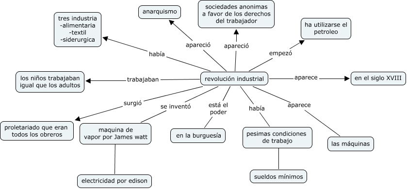 Este mapa conceptual tiene información relacionada a: 05-Juan José Barroso Ponce, revolución industrial aparece en el siglo XVIII, revolución industrial apareció sociedades anonimas a favor de los derechos del trabajador, revolución industrial había tres industria -alimentaria -textil -siderurgica, revolución industrial está el poder en la burguesía, revolución industrial empezó ha utilizarse el petroleo, revolución industrial aparece las máquinas, maquina de vapor por James watt ???? electricidad por edison, revolución industrial había pesimas condiciones de trabajo, revolución industrial apareció anarquismo, pesimas condiciones de trabajo sueldos mínimos
