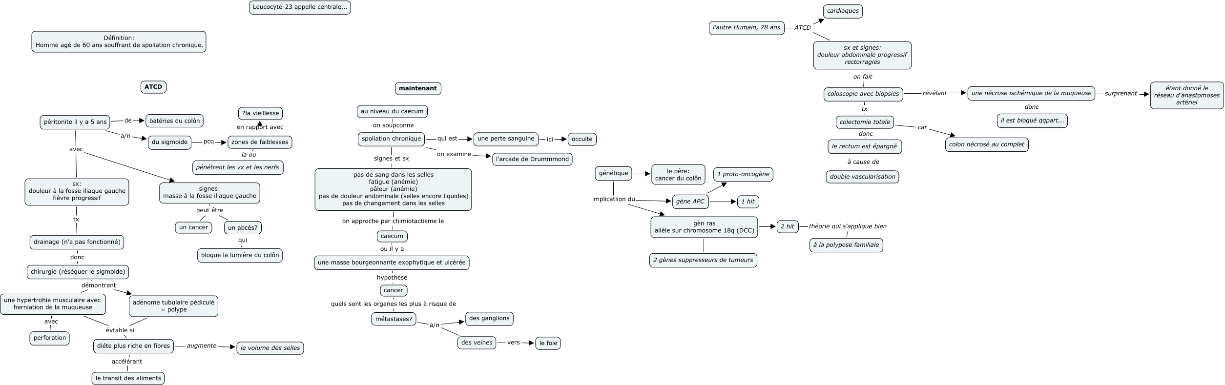 This Concept Map, created with IHMC CmapTools, has information related to: app 3 final, chirurgie (réséquer le sigmoide) démontrant adénome tubulaire pédiculé = polype, diéte plus riche en fibres accélérant le transit des aliments, cancer quels sont les organes les plus à risque de métastases?, coloscopie avec biopsies révélant une nécrose ischémique de la muqueuse, génétique implicatiion du gène APC, une perte sanguine ici occulte, colectomie totale donc le rectum est épargné, gène APC 1 proto-oncogène, une hypertrohie musculaire avec herniation de la muqueuse évtable si diéte plus riche en fibres, pas de sang dans les selles fatigue (anémie) pâleur (anémie) pas de douleur andominale (selles encore liquides) pas de changement dans les selles on approche par chimiotactisme le caecum, adénome tubulaire pédiculé = polype évtable si diéte plus riche en fibres, zones de faiblesses la ou pénétrent les vx et les nerfs, chirurgie (réséquer le sigmoide) démontrant une hypertrohie musculaire avec herniation de la muqueuse, métastases? a/n des ganglions, diéte plus riche en fibres augmente le volume des selles, signes: masse à la fosse iliaque gauche peut être un abcès?, du sigmoide pcq zones de faiblesses, 2 hit théorie qui s'applique bien à la polypose familiale, une nécrose ischémique de la muqueuse surprenant étant donné le réseau d'anastomoses artériel, gèn ras allèle sur chromosome 18q (DCC) 2 gènes suppresseurs de tumeurs