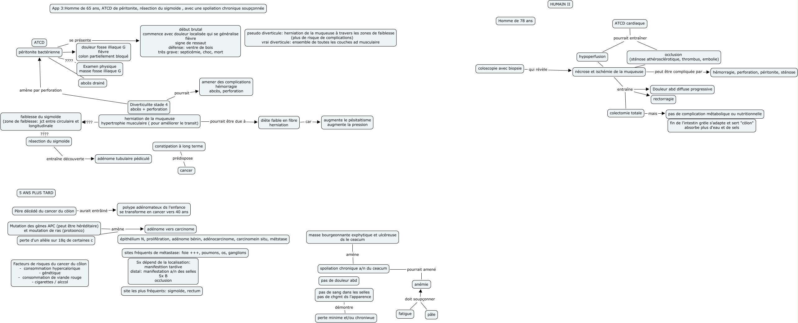 This Concept Map, created with IHMC CmapTools, has information related to: app 3 retour, péritonite bactérienne ???? Examen physique masse fosse illiaque G, Diverticulite stade 4 abcès + perforation pourrait amener des complications hémorragie abcès, perforation, Diverticulite stade 4 abcès + perforation amène par perforation péritonite bactérienne, faiblesse du sigmoïde (zone de faiblesse: jct entre circulaire et longitudinale ???? résection du sigmoïde, masse bourgeonnante exphytique et ulcéreuse ds le ceacum amène spoliation chronique a/n du ceacum, diète faible en fibre herniation car augmente le pésitaltisme augmente la pression, résection du sigmoïde entraîne découverte adénome tubulaire pédiculé, nécrose et ischémie de la muqueuse entraîne Douleur abd diffuse progressive, nécrose et ischémie de la muqueuse entraîne colectomie totale, Père décédé du cancer du cölon aurait entrâiné polype adénomateux ds l'enfance se transforme en cancer vers 40 ans, perte d'un allèle sur 18q de certaines c amène adénome vers carcinome, fatigue doit soupçonner anémie, péritonite bactérienne douleur fosse illiaque G fièvre colon partiellement bloqué, péritonite bactérienne se présente début brutal commence avec douleur localisée qui se généralise fièvre signe de ressaut défense: ventre de bois très grave: septicémie, choc, mort, pas de sang dans les selles pas de chgmt ds l'apparence démontre perte minime et/ou chroniwue, occlusion (sténose athérosclérotique, thrombus, embolie) ???? nécrose et ischémie de la muqueuse, ATCD cardiaque pourrait entraîner hypoperfusion, spoliation chronique a/n du ceacum pourrait amené anémie, herniation de la muqueuse hypertrophie musculaire ( pour améliorer le transit) ???? faiblesse du sigmoïde (zone de faiblesse: jct entre circulaire et longitudinale, constipation à long terme prédispose cancer