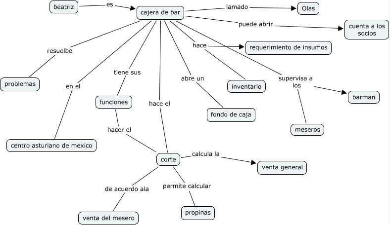 Este mapa conceptual tiene información relacionada a: trobajo de beatriz hecho por Manuel, corte calcula la venta general, cajera de bar hace inventario, cajera de bar puede abrir cuenta a los socios, cajera de bar tiene sus funciones, beatriz es cajera de bar, cajera de bar hace requerimiento de insumos, cajera de bar en el centro asturiano de mexico, cajera de bar supervisa a los meseros, cajera de bar lamado Olas, cajera de bar hace el corte, corte permite calcular propinas, cajera de bar resuelbe problemas, cajera de bar supervisa a los barman, cajera de bar abre un fondo de caja, funciones hacer el corte, corte de acuerdo ala venta del mesero