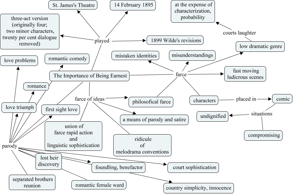 Questa Mappa Concettuale ha informazioni correlate a: The Importance of Being Earnest. Philosophical farce, The Importance of Being Earnest farce of ideas philosofical farce, The Importance of Being Earnest farce philosofical farce, The Importance of Being Earnest parody first sight love, comic situations compromising, The Importance of Being Earnest farce low dramatic genre, The Importance of Being Earnest parody court sophistication, The Importance of Being Earnest parody romantic comedy, The Importance of Being Earnest farce misunderstandings, The Importance of Being Earnest farce of ideas ridicule of melodrama conventions, The Importance of Being Earnest parody separated brothers reunion