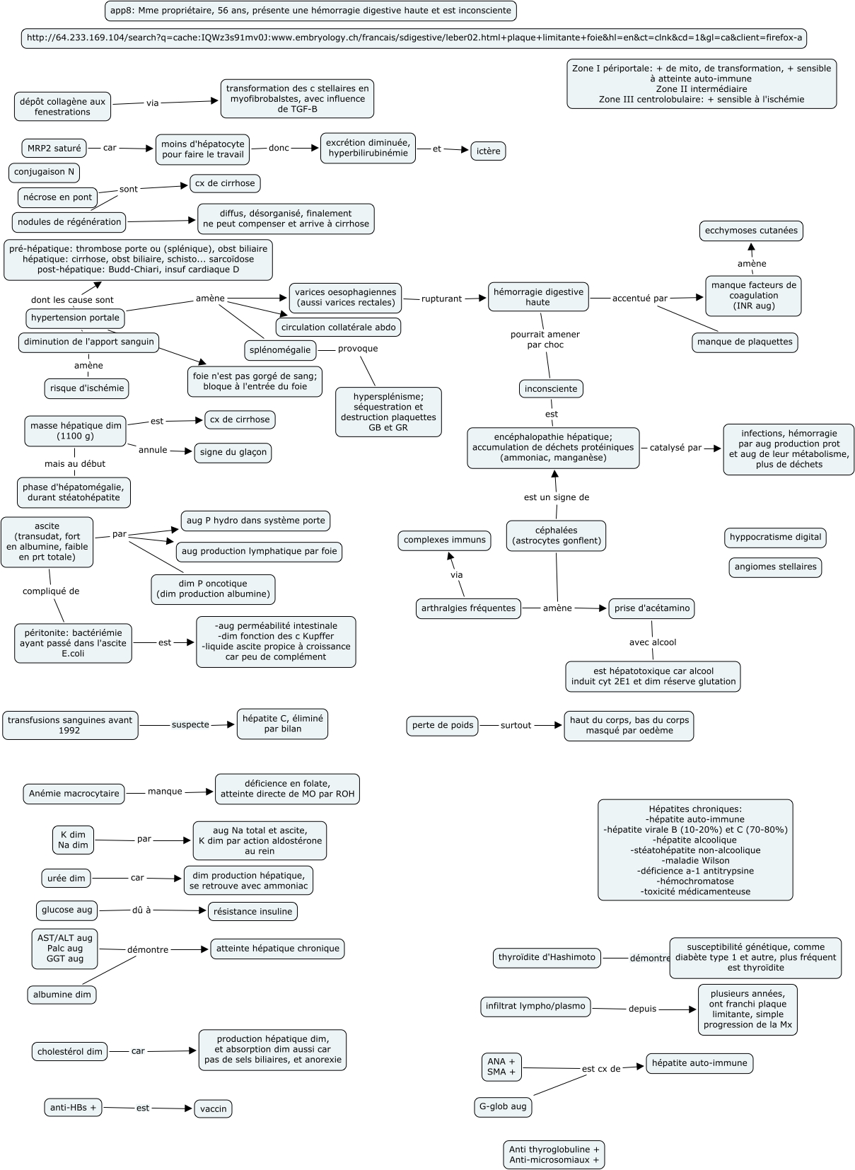 This Concept Map, created with IHMC CmapTools, has information related to: app8, encéphalopathie hépatique; accumulation de déchets protéiniques (ammoniac, manganèse) catalysé par infections, hémorragie par aug production prot et aug de leur métabolisme, plus de déchets, dépôt collagène aux fenestrations via transformation des c stellaires en myofibrobalstes, avec influence de TGF-B, nodules de régénération diffus, désorganisé, finalement ne peut compenser et arrive à cirrhose, nodules de régénération sont cx de cirrhose, hypertension portale amène splénomégalie, manque facteurs de coagulation (INR aug) amène ecchymoses cutanées, excrétion diminuée, hyperbilirubinémie et ictère, péritonite: bactériémie ayant passé dans l'ascite E.coli est -aug perméabilité intestinale -dim fonction des c Kupffer -liquide ascite propice à croissance car peu de complément, moins d'hépatocyte pour faire le travail donc excrétion diminuée, hyperbilirubinémie, MRP2 saturé car moins d'hépatocyte pour faire le travail, thyroïdite d'Hashimoto démontre susceptibilité génétique, comme diabète type 1 et autre, plus fréquent est thyroïdite, cholestérol dim car production hépatique dim, et absorption dim aussi car pas de sels biliaires, et anorexie, prise d'acétamino avec alcool est hépatotoxique car alcool induit cyt 2E1 et dim réserve glutation, hémorragie digestive haute accentué par manque de plaquettes, hémorragie digestive haute accentué par manque facteurs de coagulation (INR aug), hypertension portale diminution de l'apport sanguin, AST/ALT aug Palc aug GGT aug démontre atteinte hépatique chronique, arthralgies fréquentes amène prise d'acétamino, transfusions sanguines avant 1992 suspecte hépatite C, éliminé par bilan, ascite (transudat, fort en albumine, faible en prt totale) par aug production lymphatique par foie